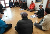 자칫하면 사람들이 다칠 수 있는 것이다. 산 뒤쪽 구간에는 아직 잔설이 그대로 있었다. 짧은 구간이지만 잔설을 조심조심 밟고 내려갔다. 법룡사 부근에 도달하니 입석리 도로와 보현산 댐 전경이 한 눈이 들어왔다. 보현산 댐 물이 모두 빠졌다. 대원들이 “댐 물이 왜 다 빠졌지”하며 댐을 관찰하기도 했다. 법룡사에 들러 물을 마시며 부처님께 잠깐 귀의하고 내려갔다. 법룡사에서 입구 도로까지 내려가는 길이 험난했다. 입구 쪽으로다 내려오니 법룡사 도로 확장 표시 깃발이 여러 군데 꽂여있어 길 확장 계획임을 알 수 있었다.