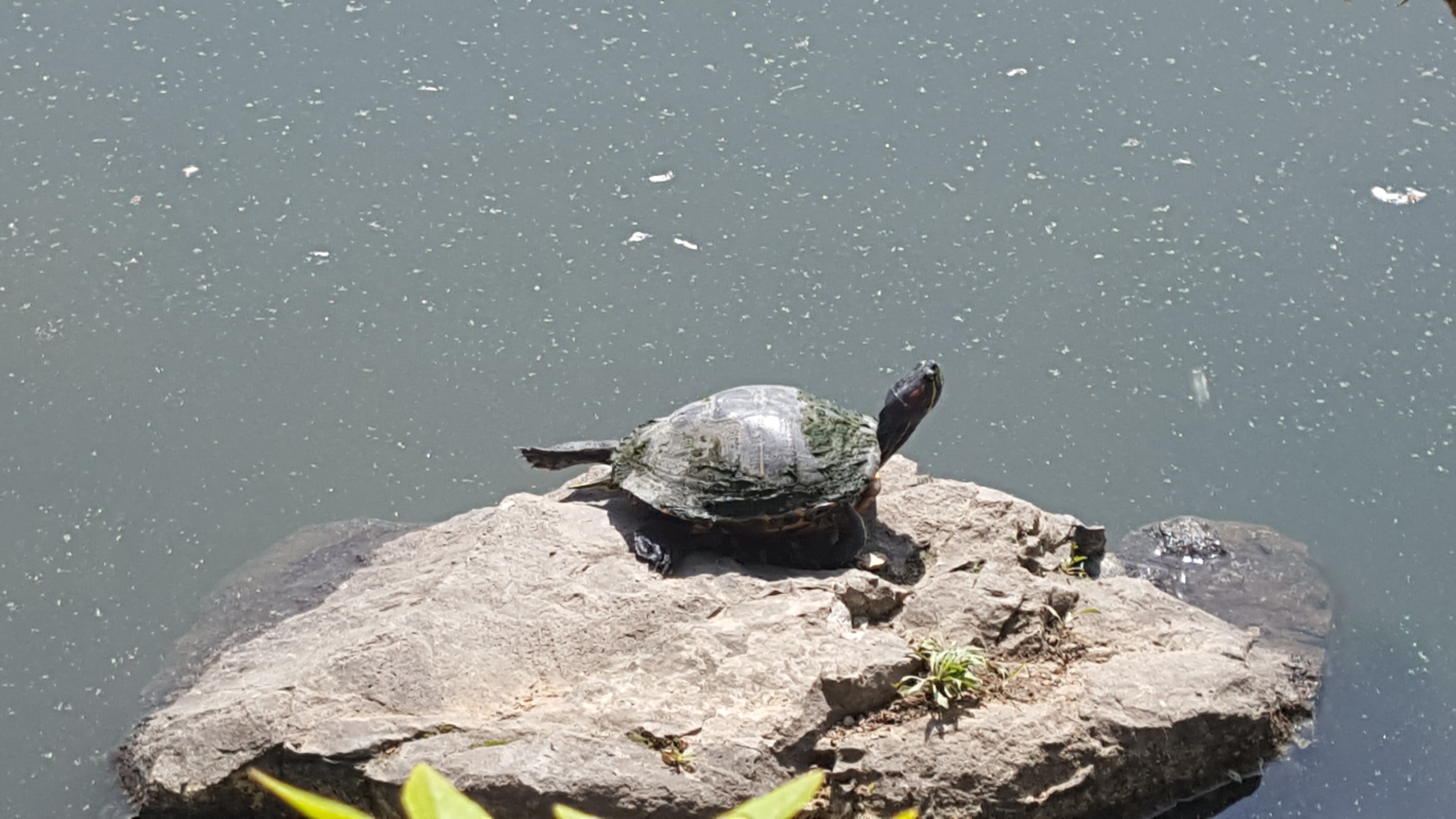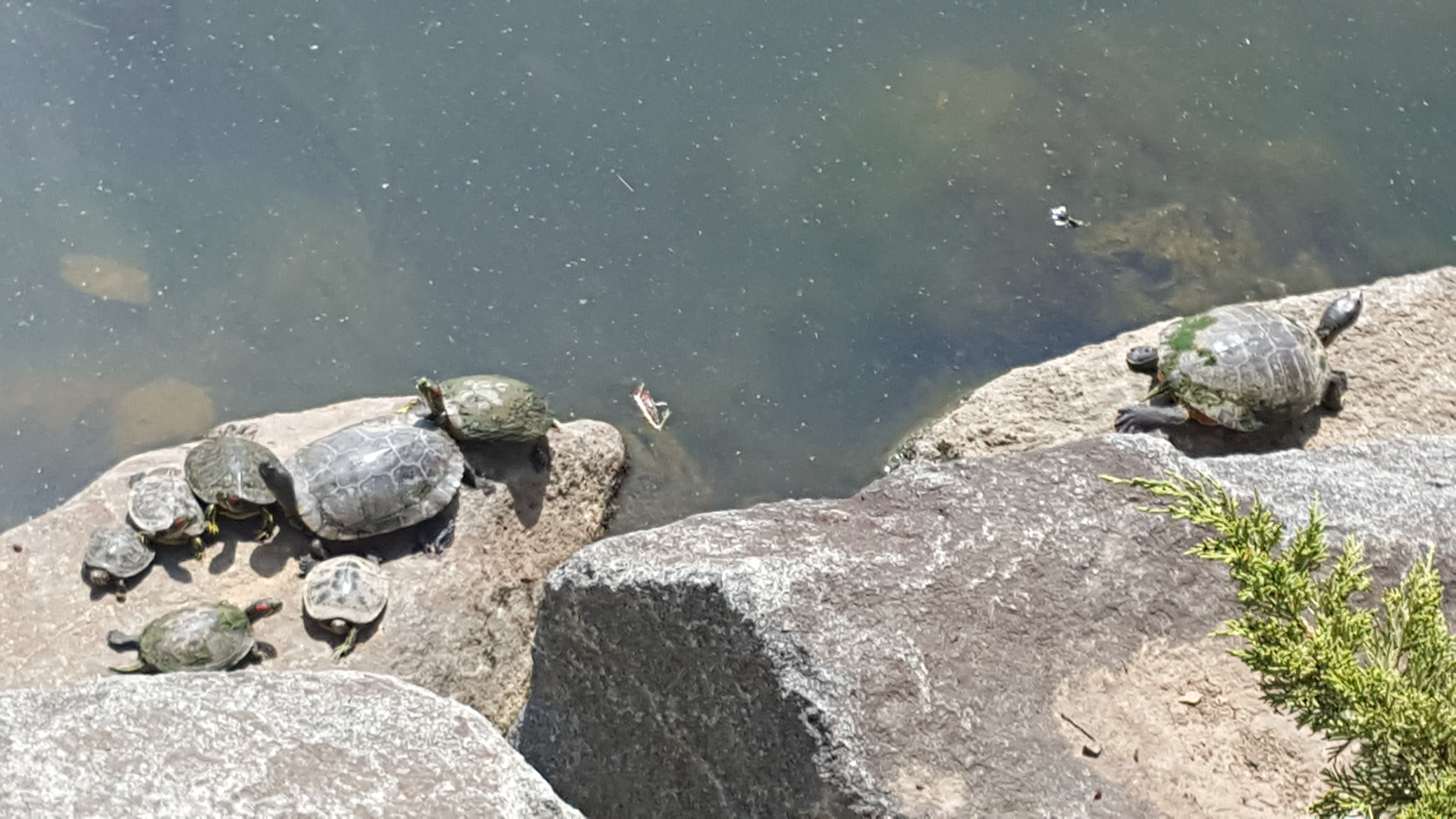 현장을 확인하니 대로변 창신아파트 입구 위쪽 연꽃이 많은 부분 우로지 가장자리에 거북이 들이 떼로 몰려다니고 있었다. 어떤 거북이는 물에서 놀고 있고 어떤 거북이는 돌(조경석)위에 올라 일광욕을 즐기고 있고 어떤 거북이는 가족끼리 나들이 한 것처럼 많은 거북이들이 우로지 한쪽 가장자리에 출현했다.