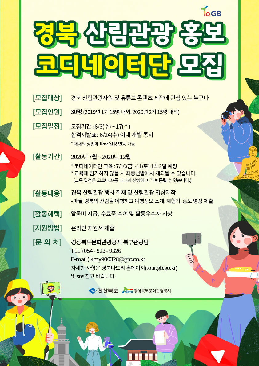 경북의 산림관광자원 및 유튜브 제작에 관심 있는 사람은 누구나 온라인(http://naver.me/xgedJ6Y7)으로 6월 3일부터 17일까지 신청하면 된다.