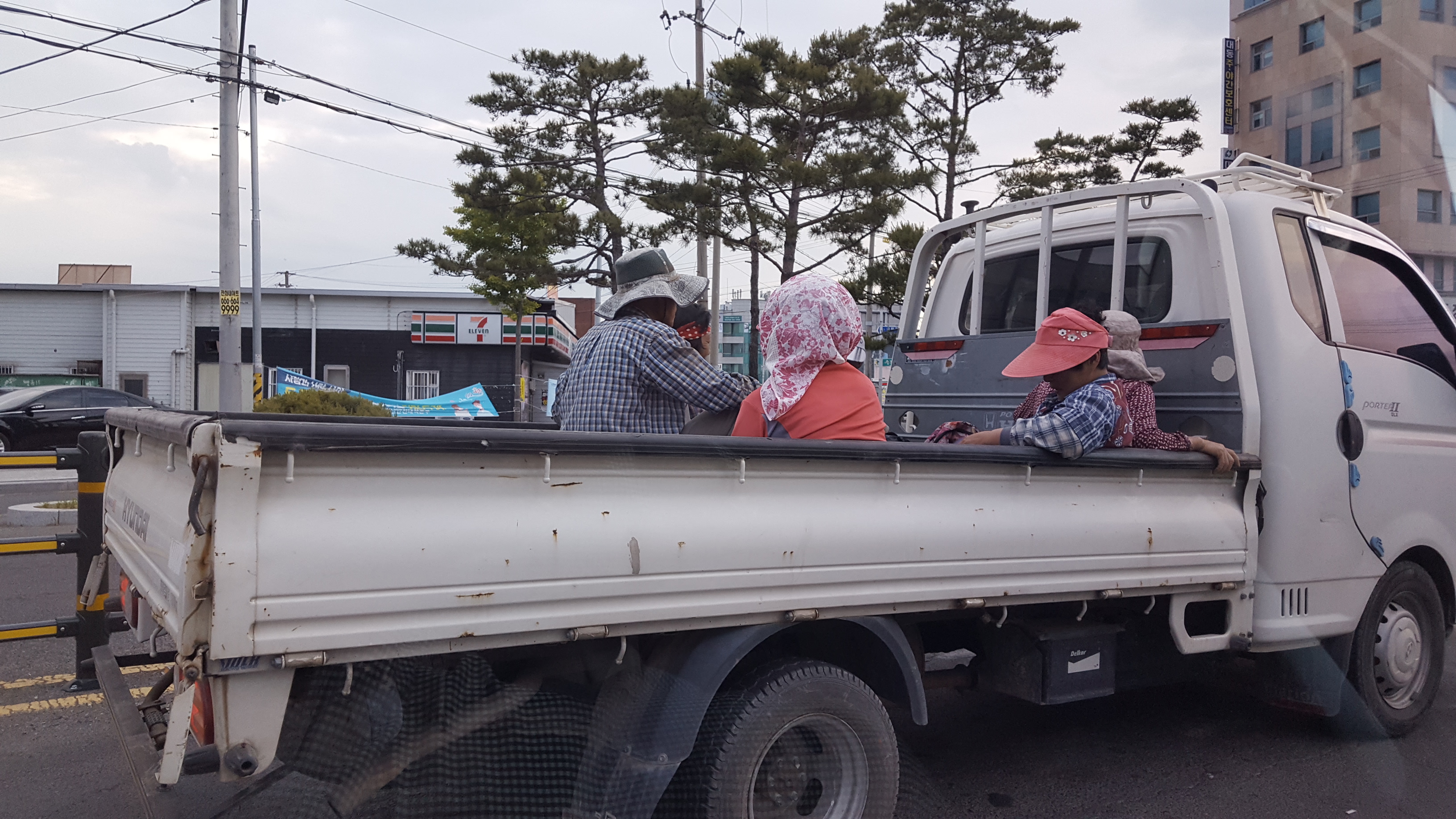 트럭 적재함위에 농촌에서 일하는 인부들로 보이는 남녀 6명의 어른들이 앉아서 이동하는 모습이 위험스러워 보인다. 농사철에는 종종 볼 수 있는 장면이나 위험에 노출된 인부들의 안전권도 항상 지켜져야 한다.