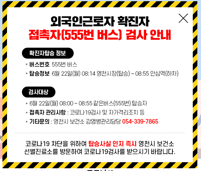 영천시는 2월 18일 코로나19 첫 확진자가 발생했으나 3월 7일부터 현재까지 사실상 추가 확진자가 발생하지 않았다(6월 3일 주소가 인천인 해외입국자 1명 제외). 이는 영천이 코로나 청정지역으로 인식되고 있는 가운데 재난지원금이 풀려 지역상권이 활기를 되찾아가고 있는 상황에서 찬물을 끼얹은 형국이 되고 있다.