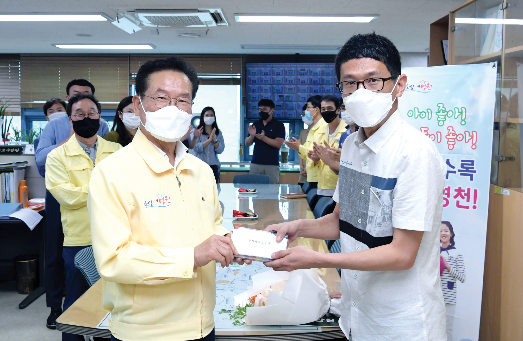 영천시는 7월 22일 최기문 시장이 직접 환경사업소를 방문해 셋째 자녀를 출산한 김석희 주무관에게 출산축하 복지포인트 300만원을 영천사랑상품권으로 전달했다.