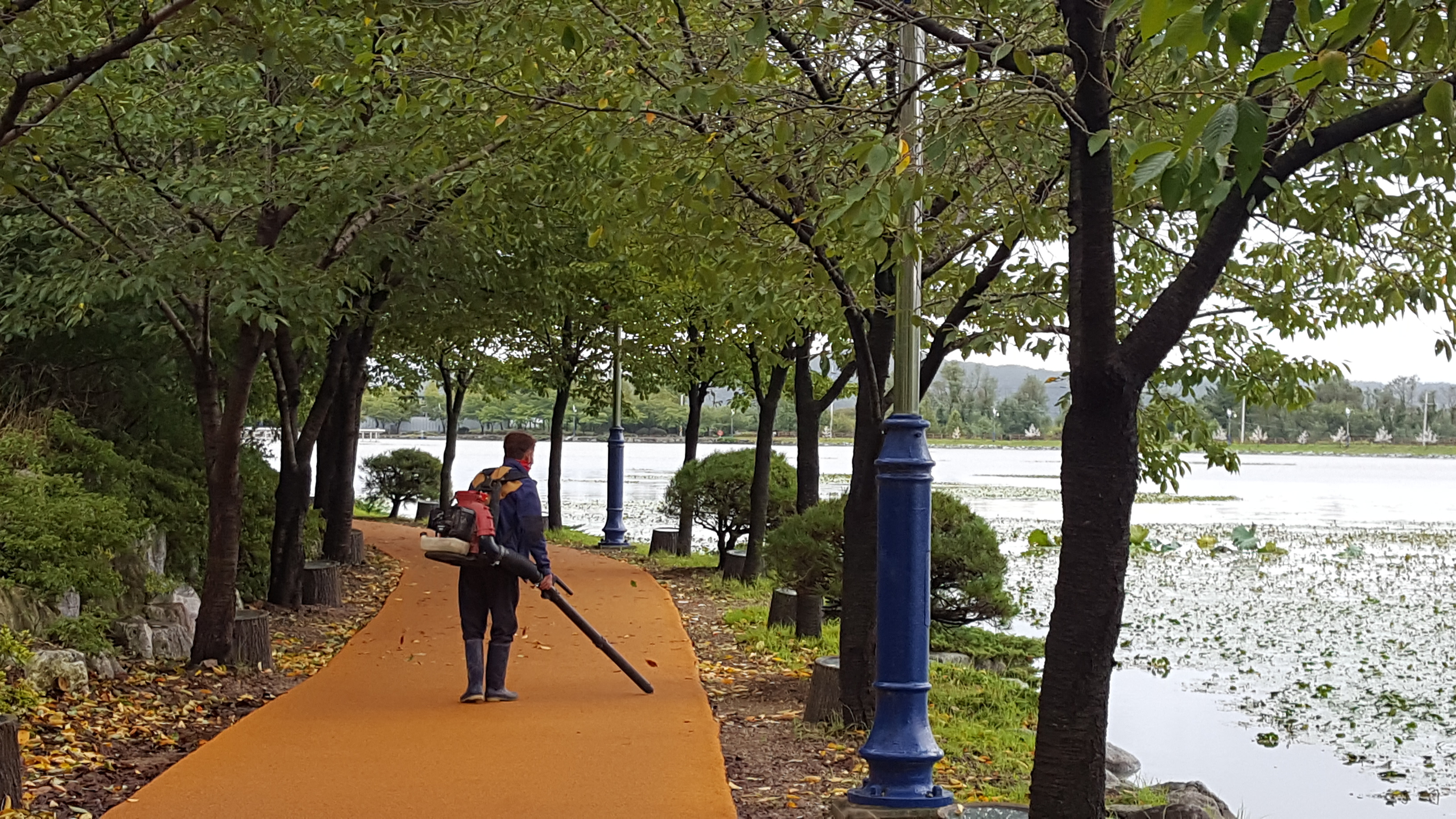 7일 오후 태풍이 북쪽으로 빠져 나가자 시내 둔치와 우로지 등 시민들이 많이 모이는 곳에는 청소 인부들이 휴대용 청소기를 들고 다니며 길에 떨어진 각종 태풍 잔해물을 청소하고 있어 일찍 산책 나온 시민들이 수고가 많다는 칭찬을 아끼지 않고 있었다.