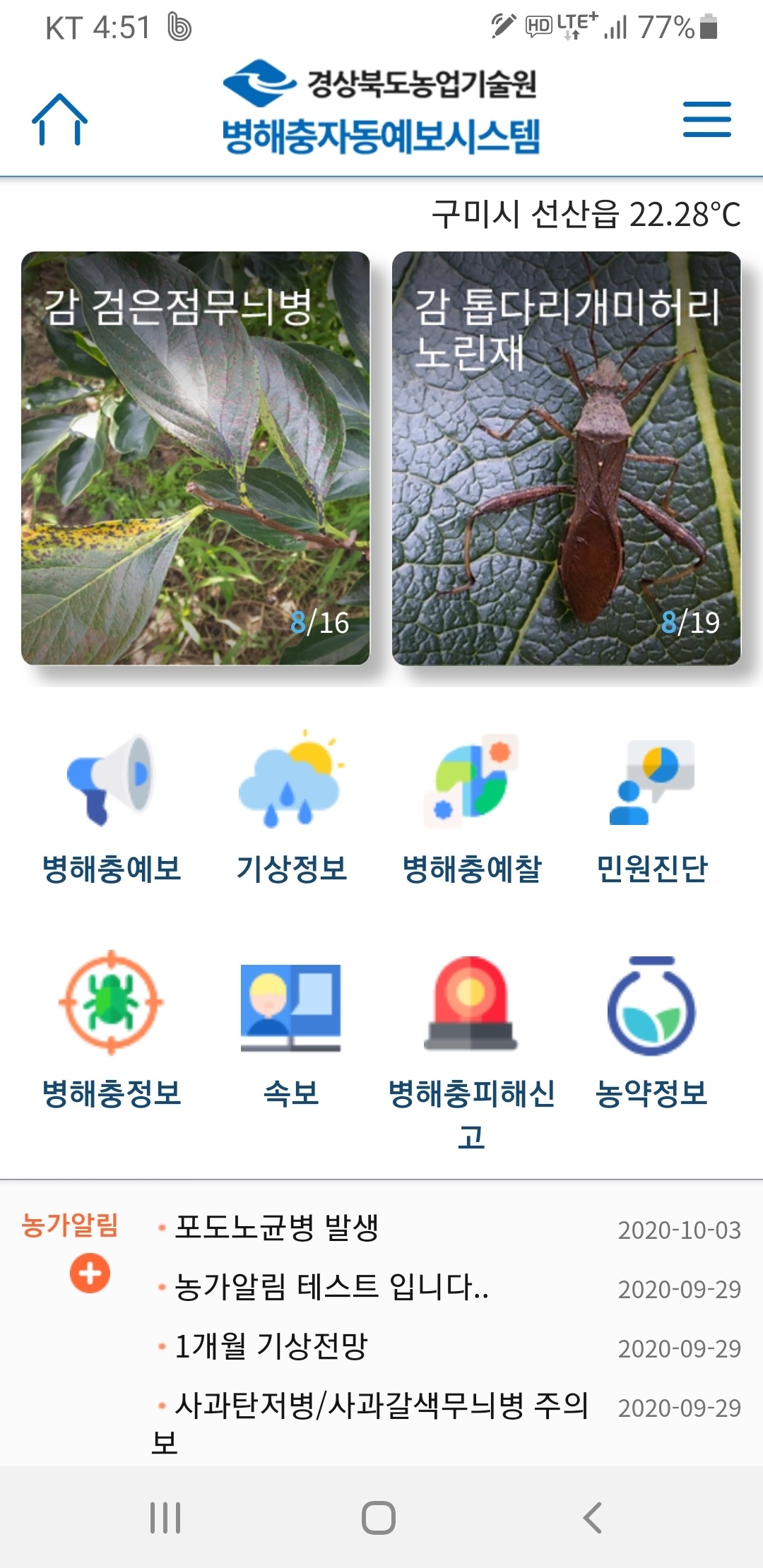 경북농업기술원은 2018년에 복숭아, 고추, 감 3작물로 시작해 점차 농작물과 병해충 예측 대상을 확대하고 있으며, 처음에는 상주, 영양, 청송 3개 시군을 대상으로 예보했으나 현재는 경북 23개 시군으로 서비스 기반을 확대했다.