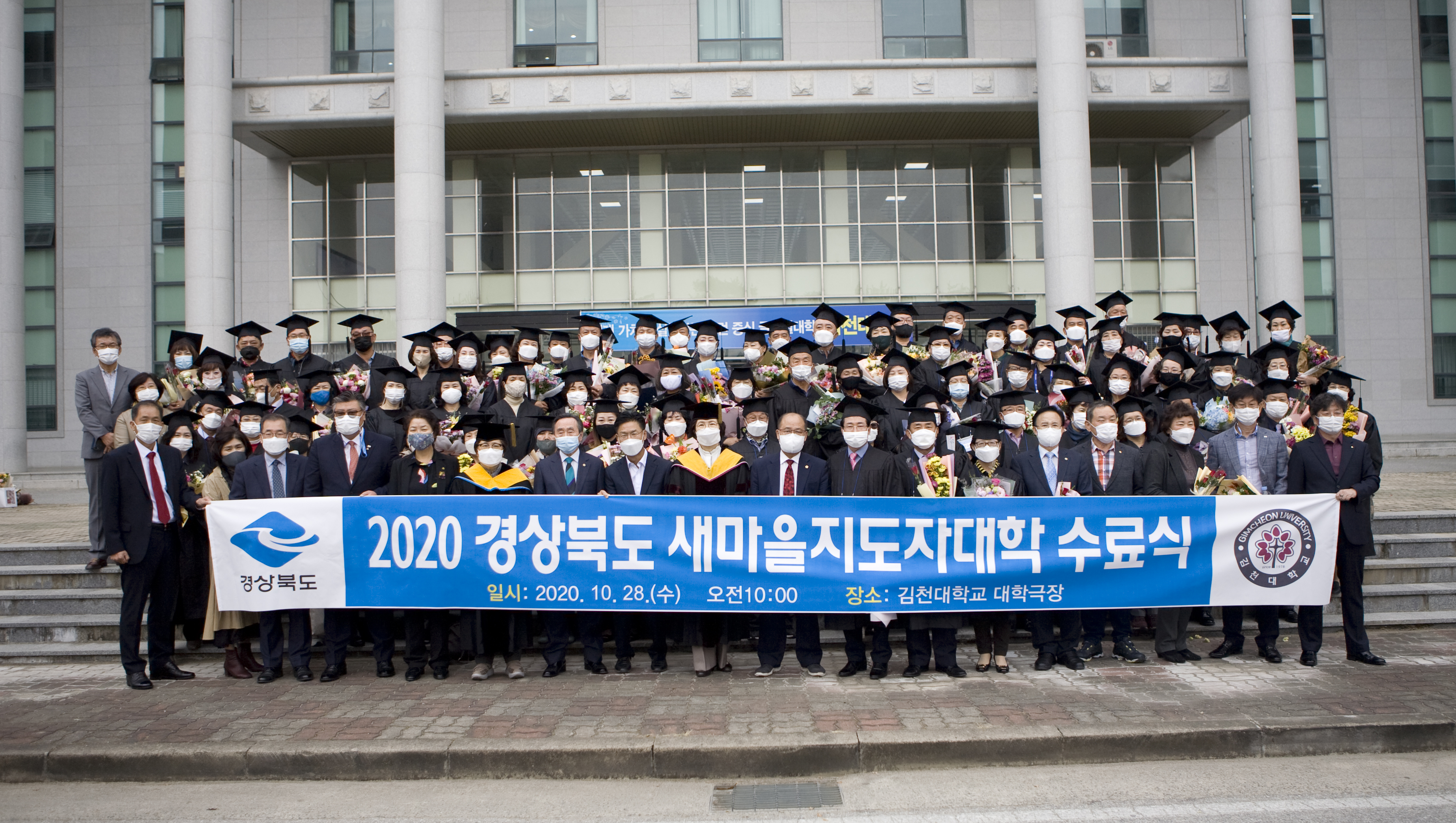 경상북도는 28일 김천대학교 대학극장에서 ‘2020 경상북도 새마을지도자대학 수료식’을 가졌다. 수료식은 코로나19 확산 방지를 위해 발열체크, 손 소독, 거리유지 등 철저한 방역수칙을 지키며 이루어졌다.