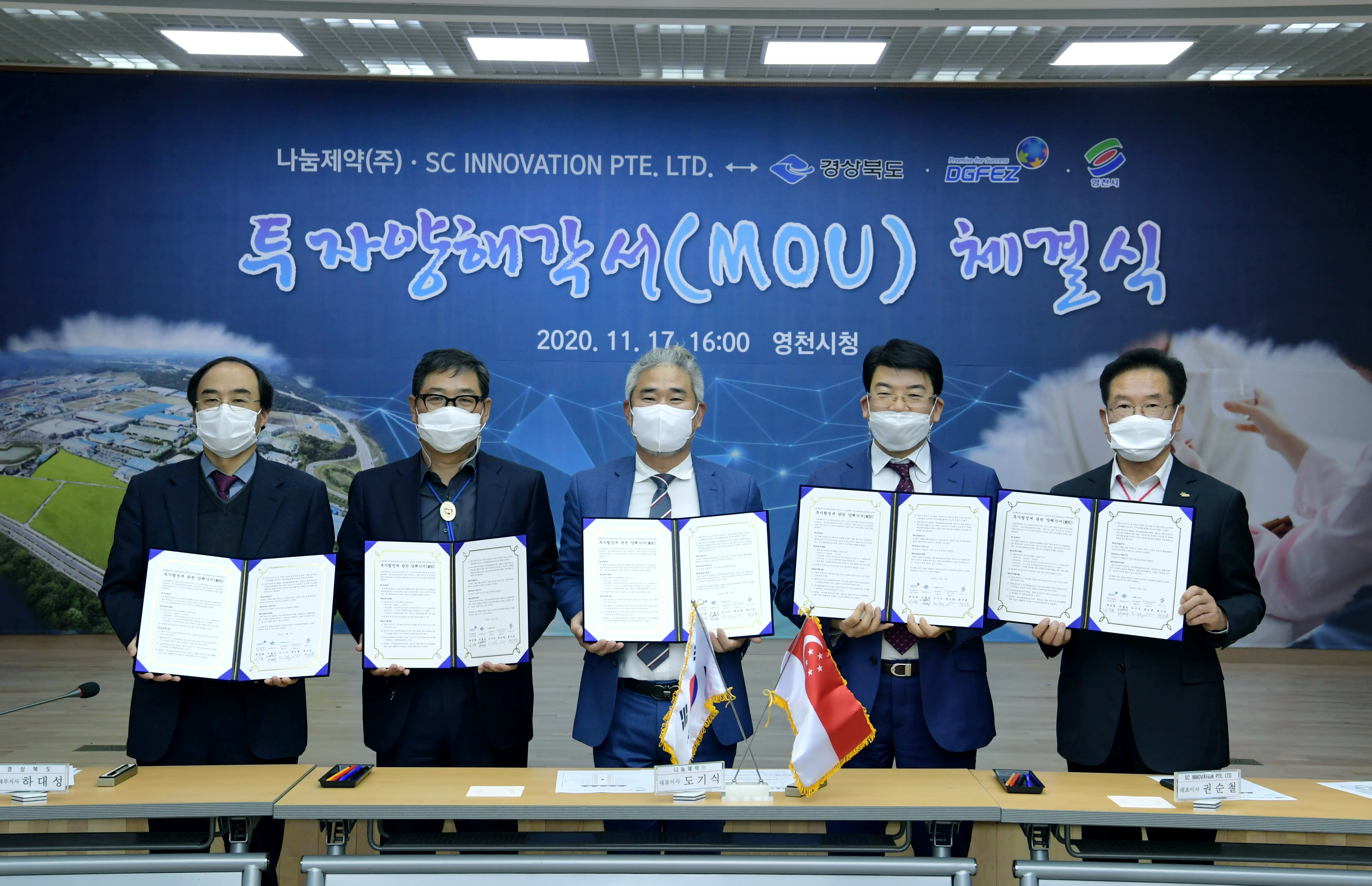 영천시는 11월 17일 경상북도, 대구경북경제자유구역청, 영천시 관계자들이 참석한 가운데 싱가포르 자본유치를 위해 ㈜나눔제약, 싱가포르 SC이노베이션과 투자양해각서를 체결했다고 밝혔다.