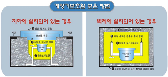 수도계량기 동파의 경우 보온조치만 잘해도 사전에 막을 수 있다. 특히 오래된 아파트나 단독주택의 경우 계량기함(통) 내부를 헌옷 등의 보온재로 채우고, 뚜껑부분은 보온재로 덮고 비닐커버 등으로 넓게 밀폐해야 한다. 수돗물을 조금씩 흐르게 해 받아서 사용하는 것도 동파 예방에 도움이 된다.