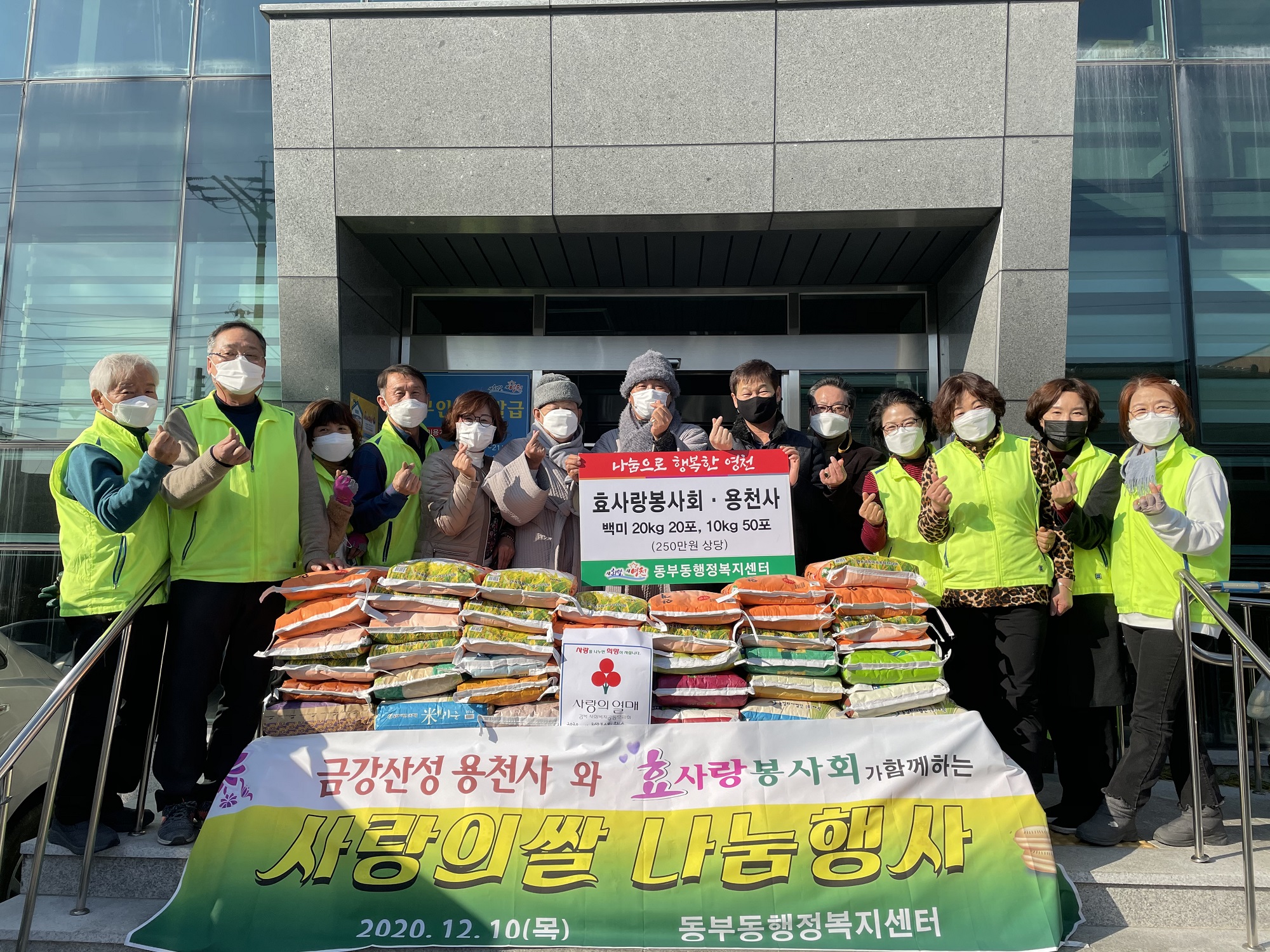 동부동(동장 조한웅)은 12월 10일 효사랑봉사회(회장 윤영한)와 영천 용천사(주지 벽봉스님)에서 백미20kg 24포, 백미10kg 42포(250만원 상당)를 기탁했다고 밝혔다.