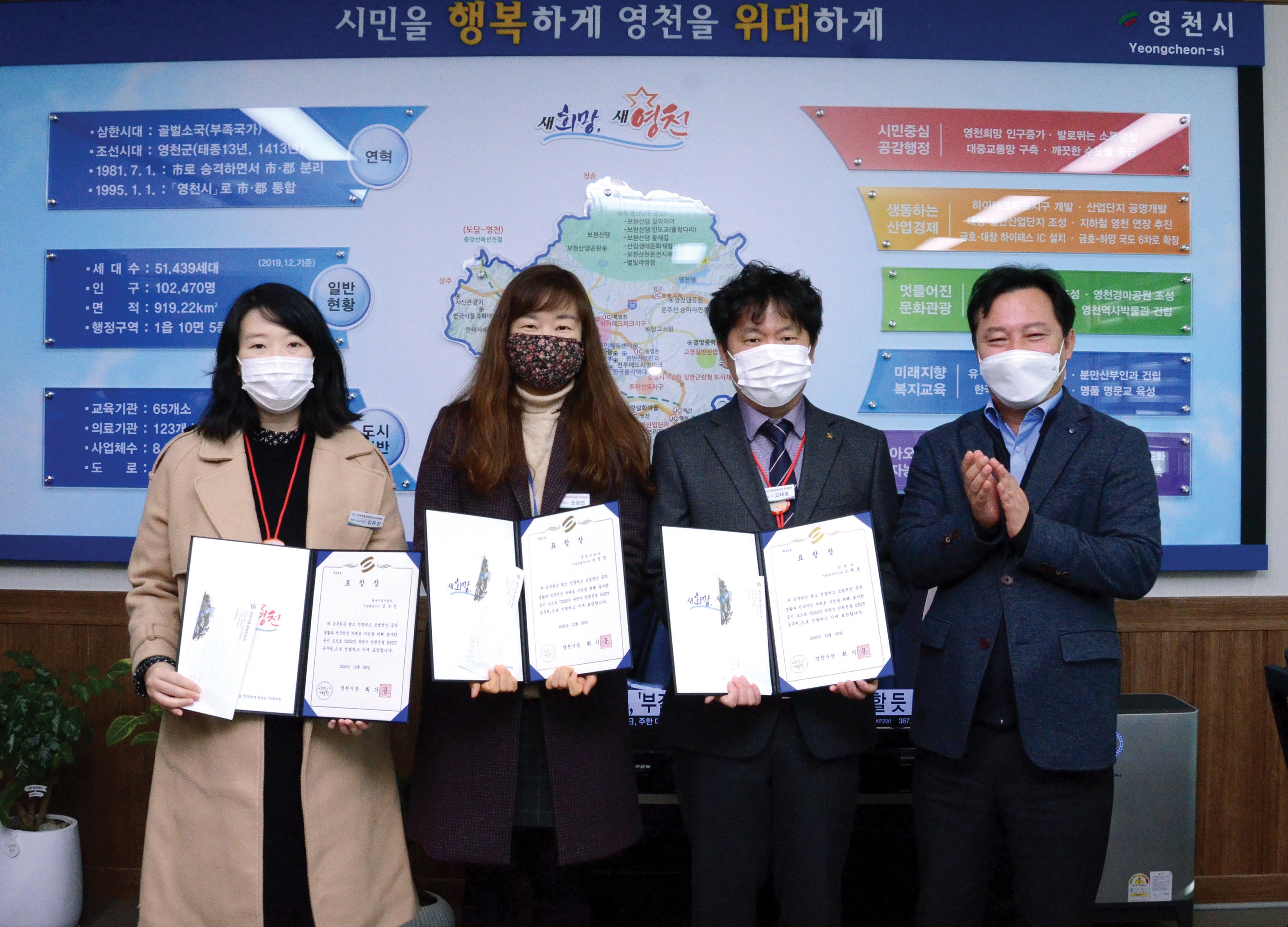 영천시는 12월 8일 2020년 하반기 민원친절BEST공무원 3인을 선정하여 표창 및 시상금을 수여해 친절행정 실현에 앞장서고 있다.