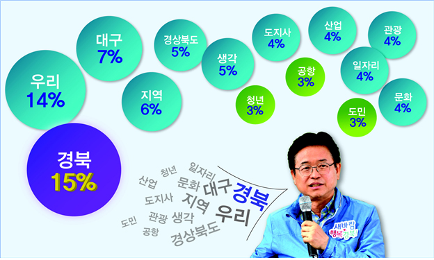 경상북도 대변인실에서 연설문에 나타난 빅테이타를 분석(민선 상반기 2년 동안)한 결과 이같은 단어를 순서대로 나열했다.