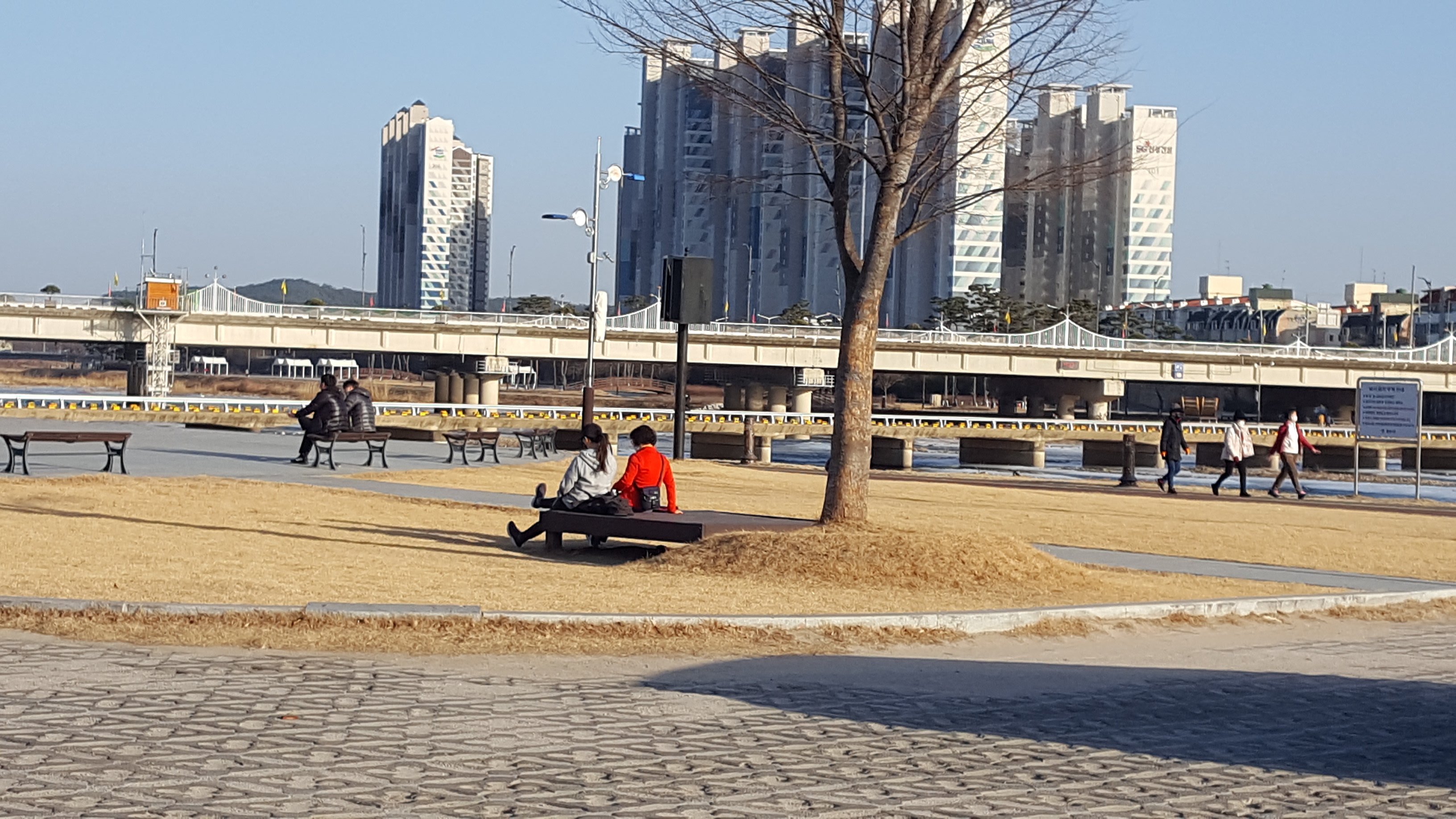 15도 정도면 3월말 또는 4월 초순 날씨, 이 바람에 시민들은 둔치에 나와 햇볕을 즐기며 친구들과 앉아 이야기하는 모습이 여기저기서 목격됐다.