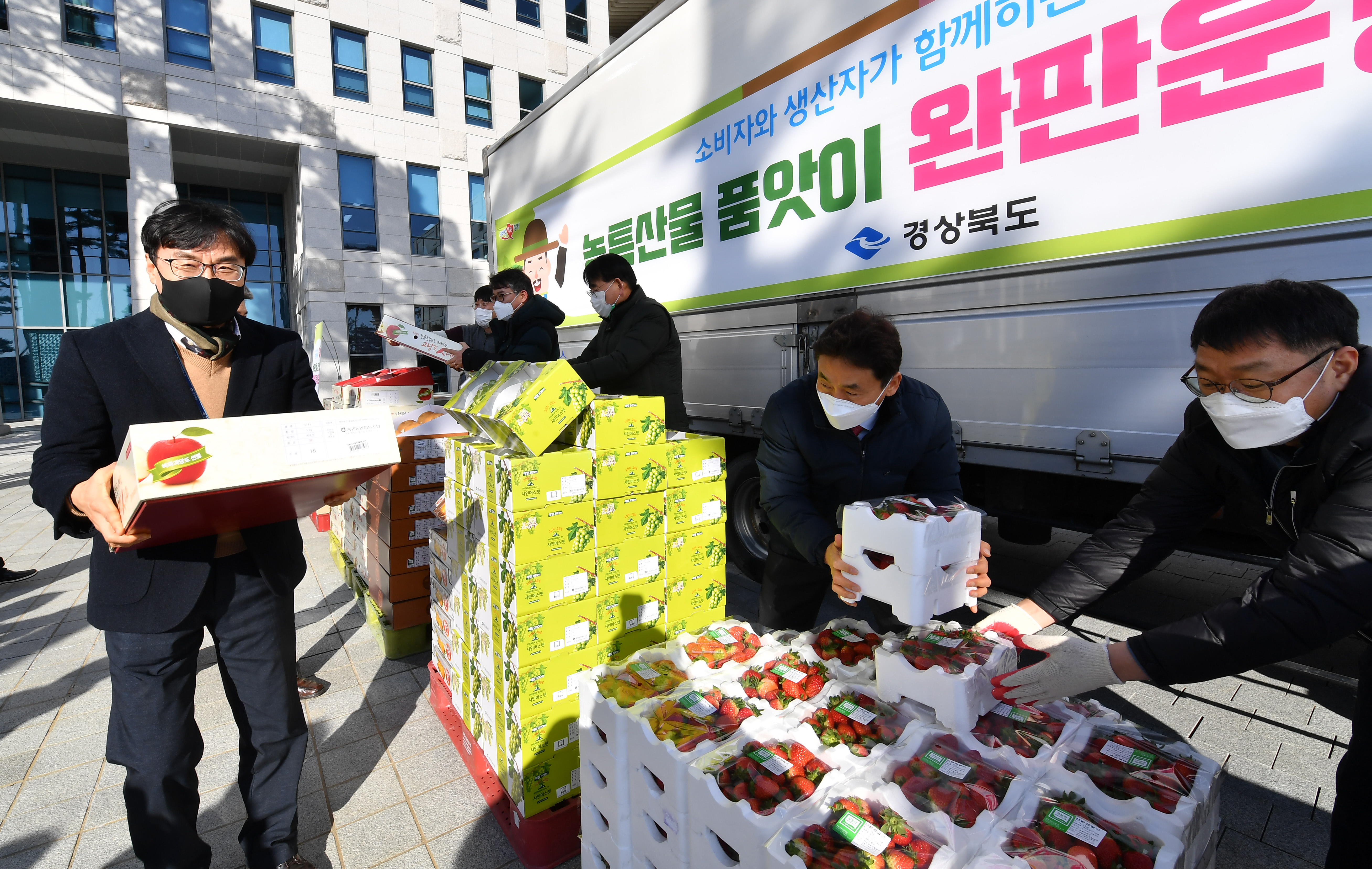 이번 행사에 공급하게 되는 농산물은 친환경농산물 꾸러미(3종) 46박스, GAP 사과(5kg) 112박스, 무농약 딸기(1kg) 120박스, 샤인머스캣(2kg) 77박스, 쌈채소(5종,1kg) 86박스 등 총 464박스를 시중가격 보다 할인된 가격으로 참여 기관별로 주문한 농산물을 도청 전정에서 배부하였다.