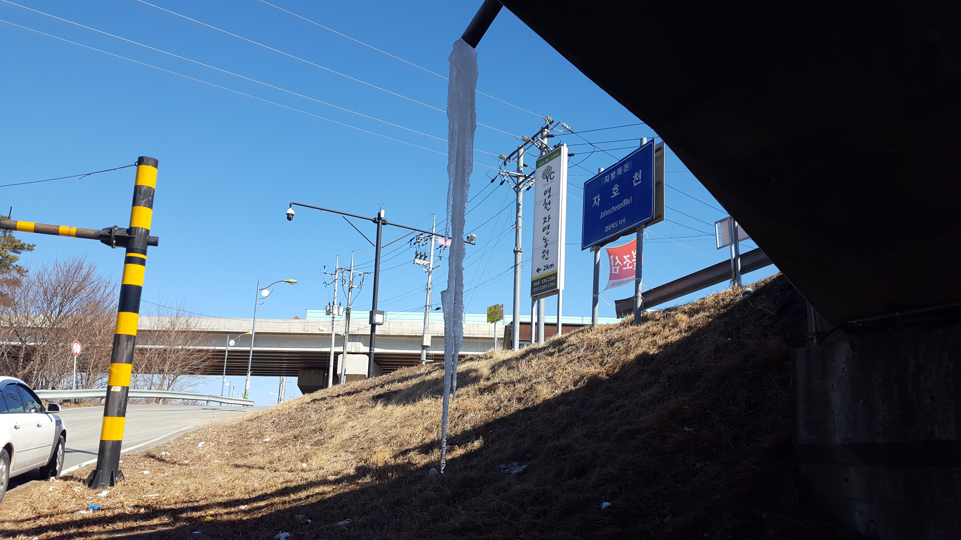 단포교 밑으로 교량 배수구에 달린 고드름이 이색적으로 구경거리가 되고 있다.