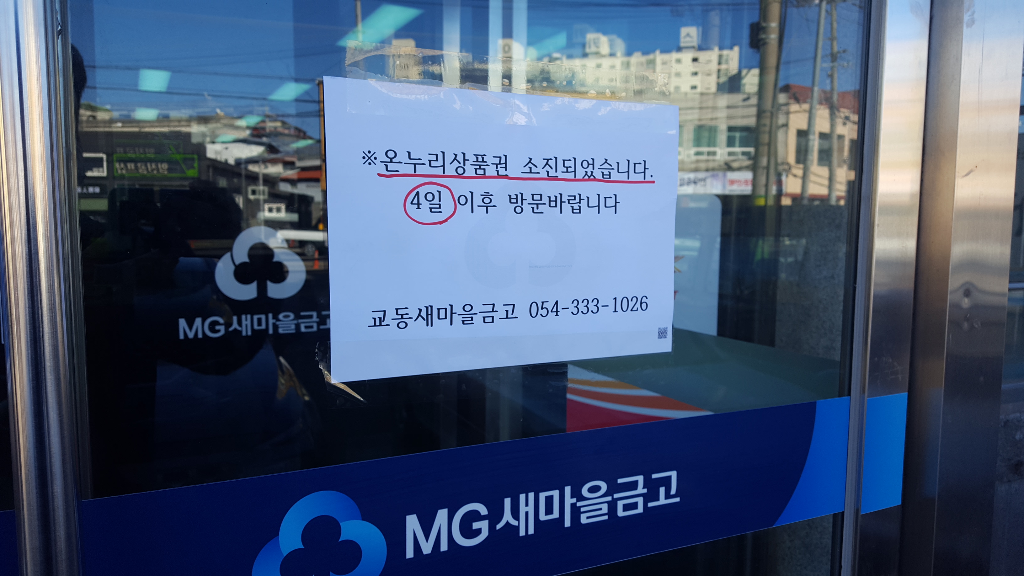 온누리상품권과 영천사랑상품권 등 상품권 인기가 날로 더해지자 교동새마을금고 입구에는 온누리 상품권 품절을 알리는 안내문이 붙었다.