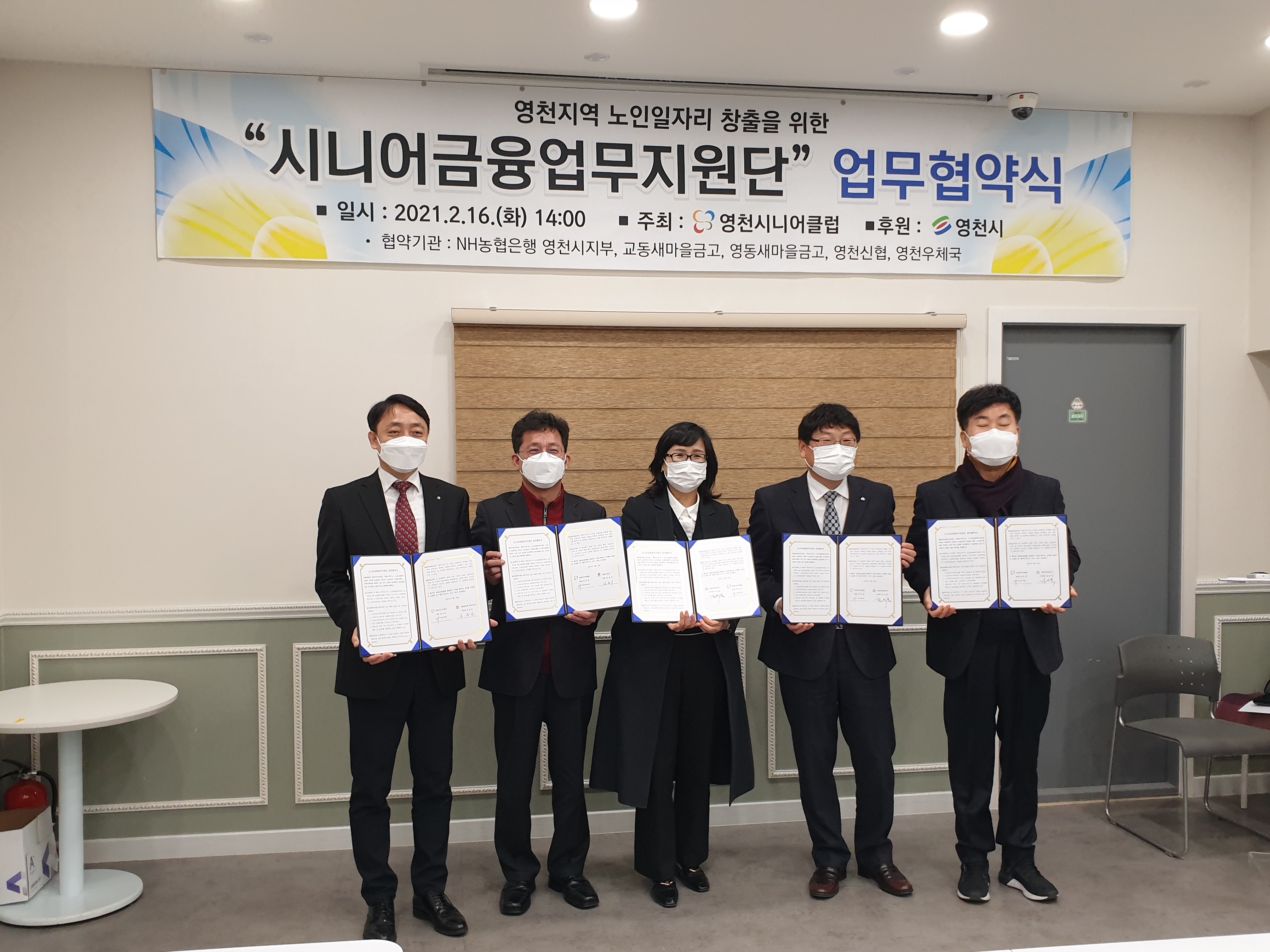 2월 16일 영천시니어클럽은 카페 모람에서 2021년 신규 사업으로 ‘시니어금융업무지원단’ 사업 추진을 위해 업무협약식을 가졌다.