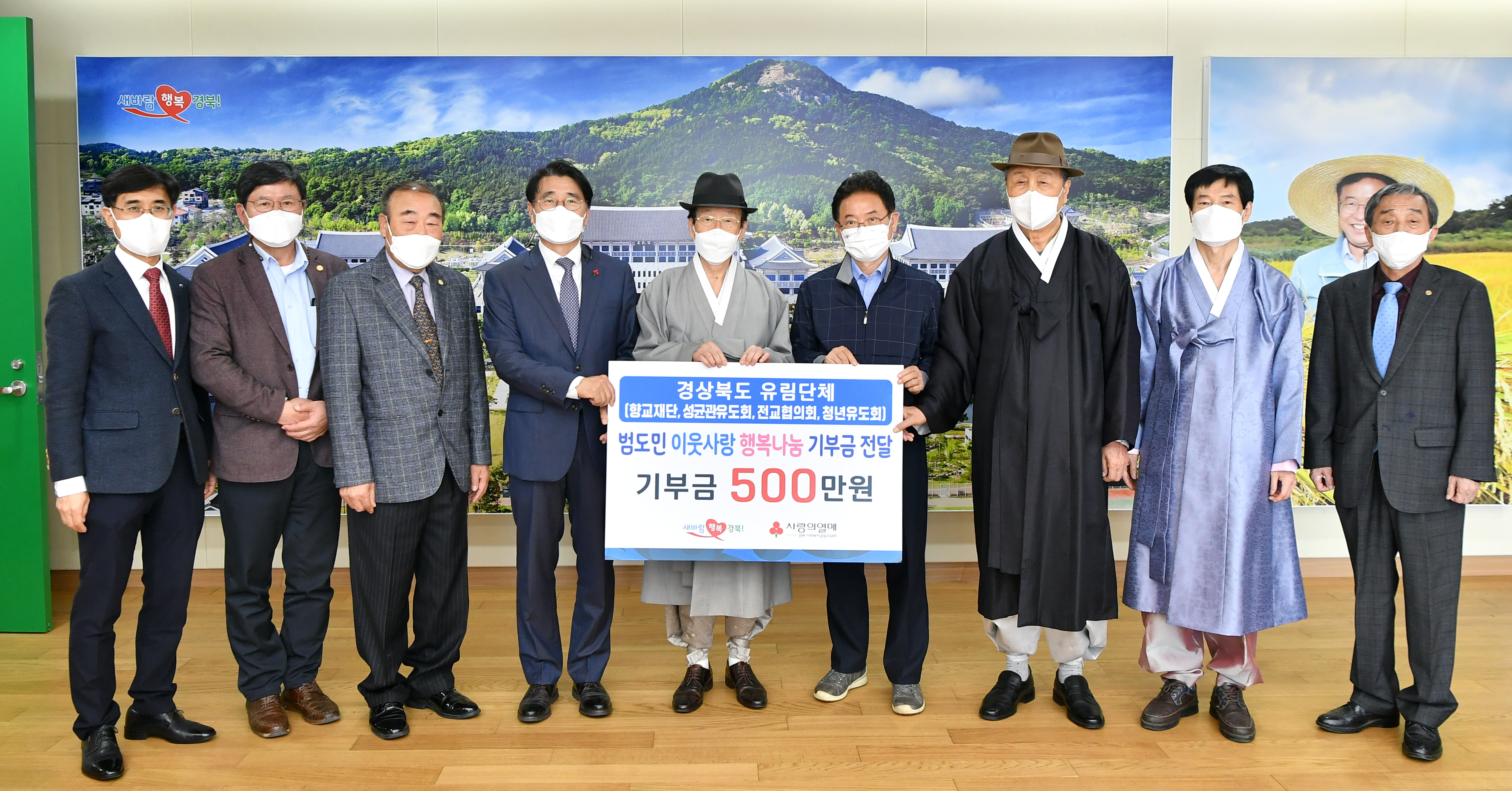 경상북도와 경북사회복지공동모금회가 추진 중인 범도민 이웃사랑 행복나눔 캠페인에 도내 유림단체의 기부금 전달식을 가졌다고 밝혔다.