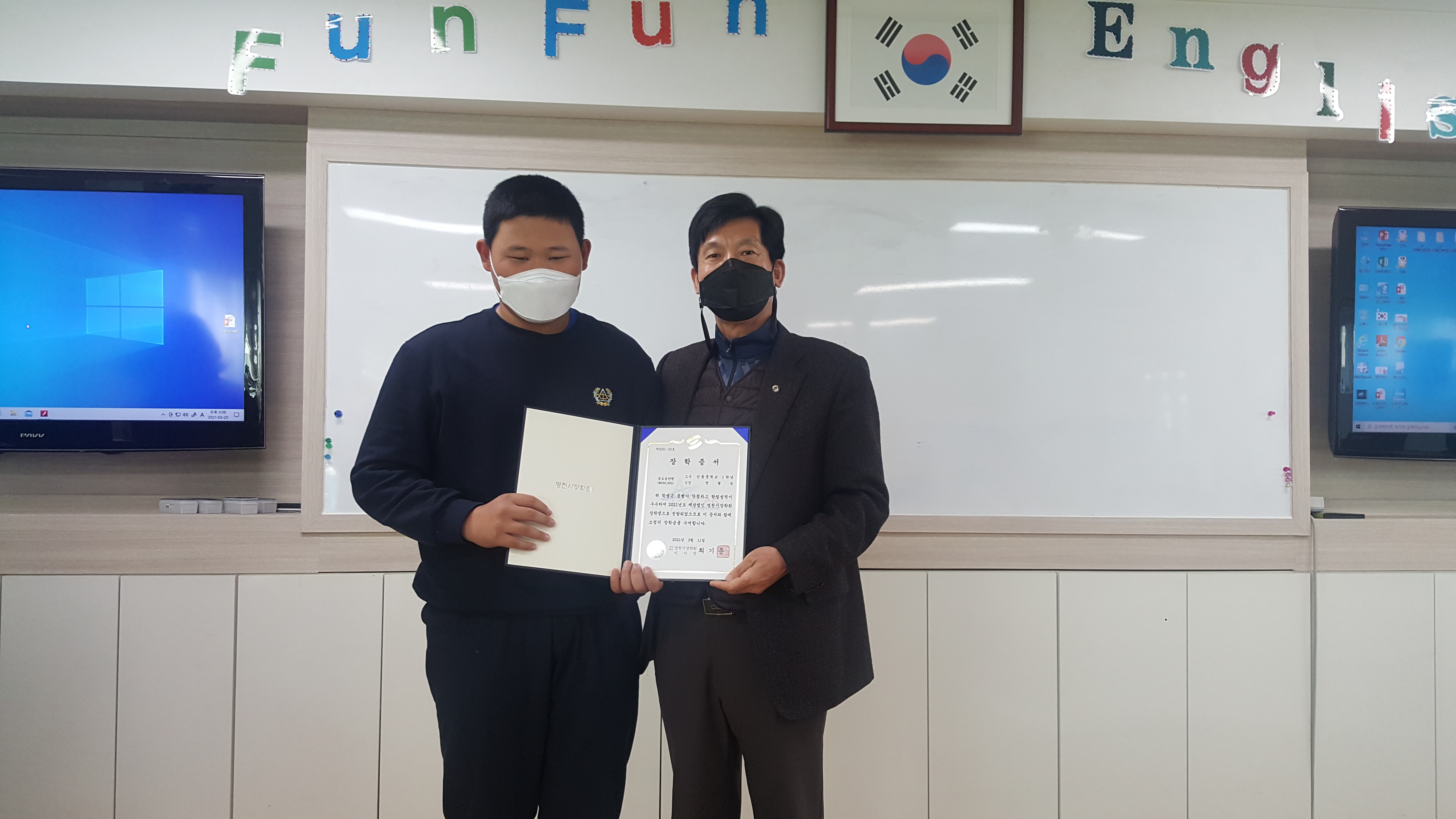 산동중학교(교장 김동환)는 3월 25일 전교생이 영어전용실에 모여 장학증서 수여식을 가졌다.