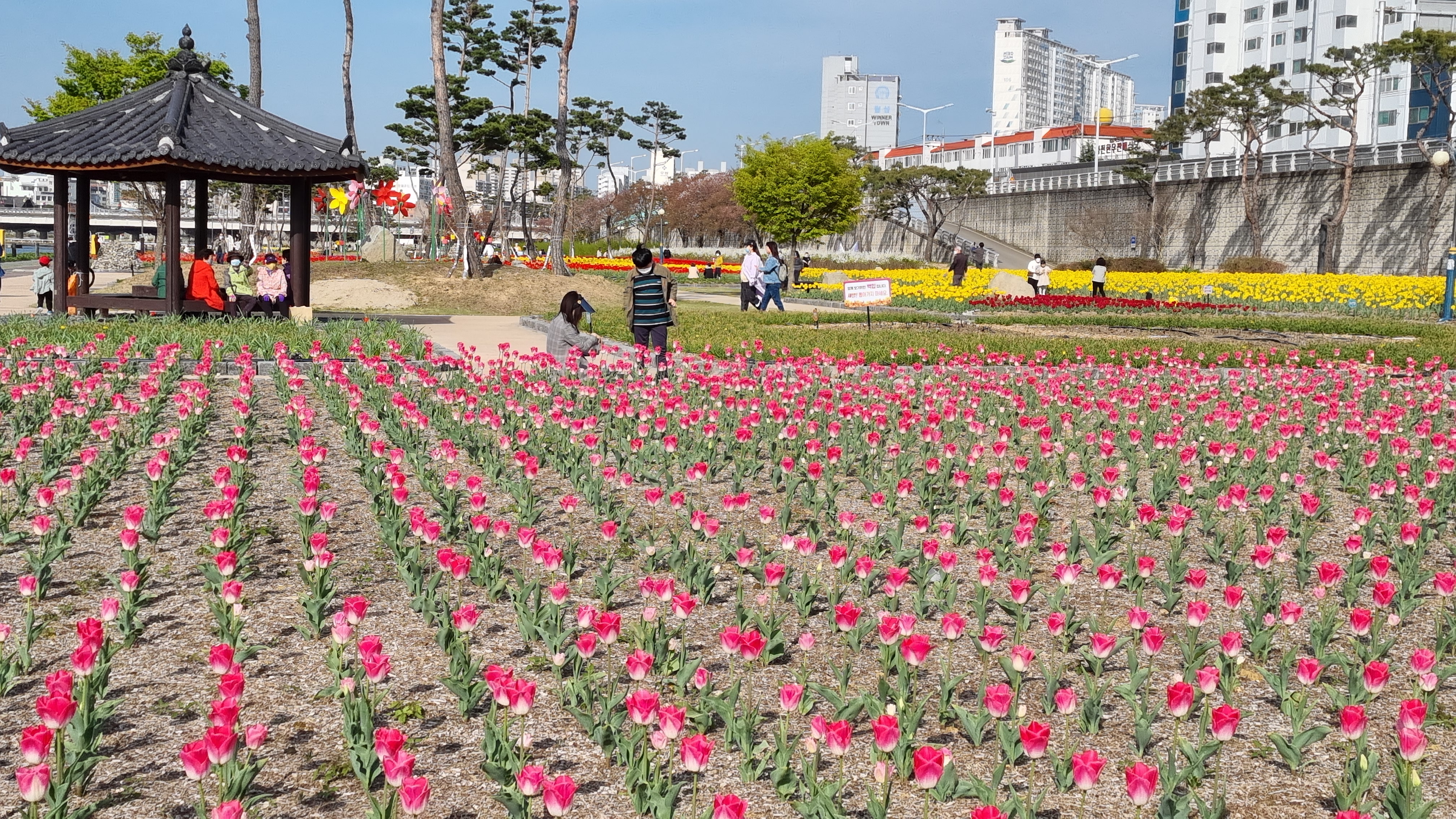 “조양각 건너편 둔치 꽃천지, 시민들나와 주말 즐기기도”