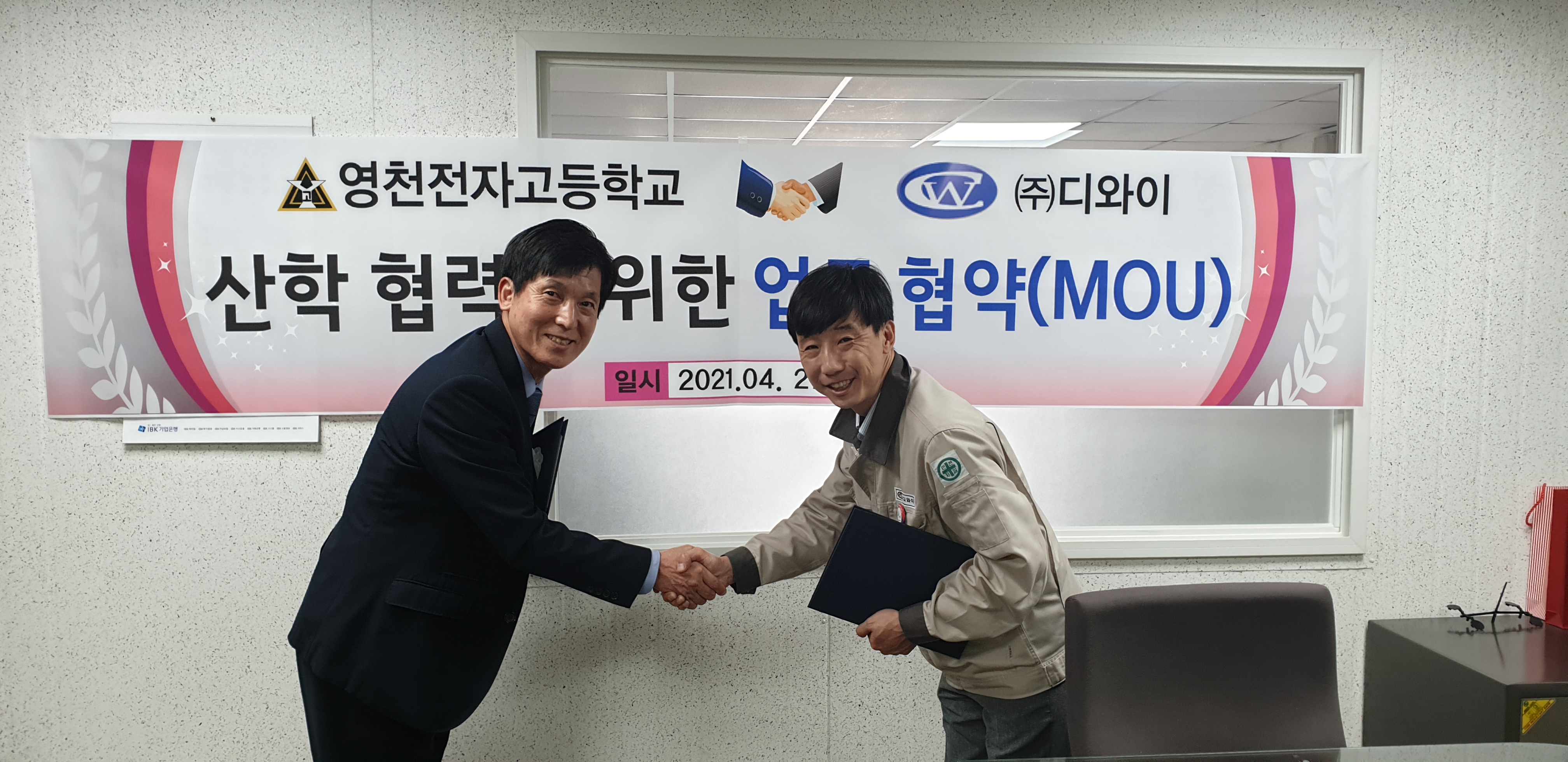 영천전자고등학교(교장 김동환)는 4월 28일 칠곡군에 위치한 ㈜디와이(대표이사 정정훈)에서 산학 협력을 위한 업무 협약식(MOU)을 진행했다. 이번 협약식에서 양 기관은 협력을 통한 인력자원의 양성과 교육 발전을 위하여 다양한 사항을 논의했다.