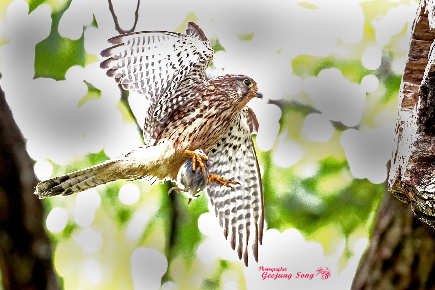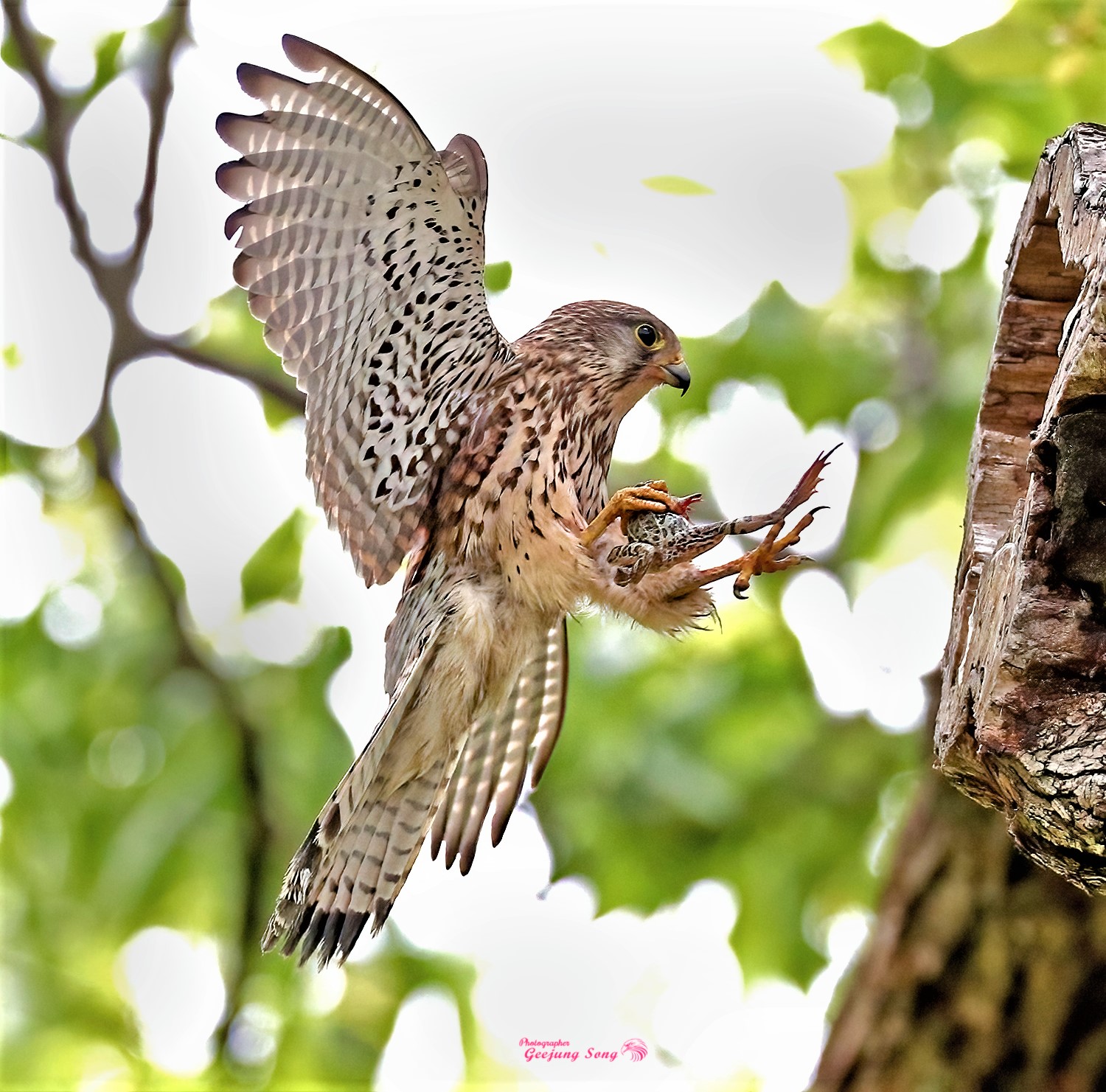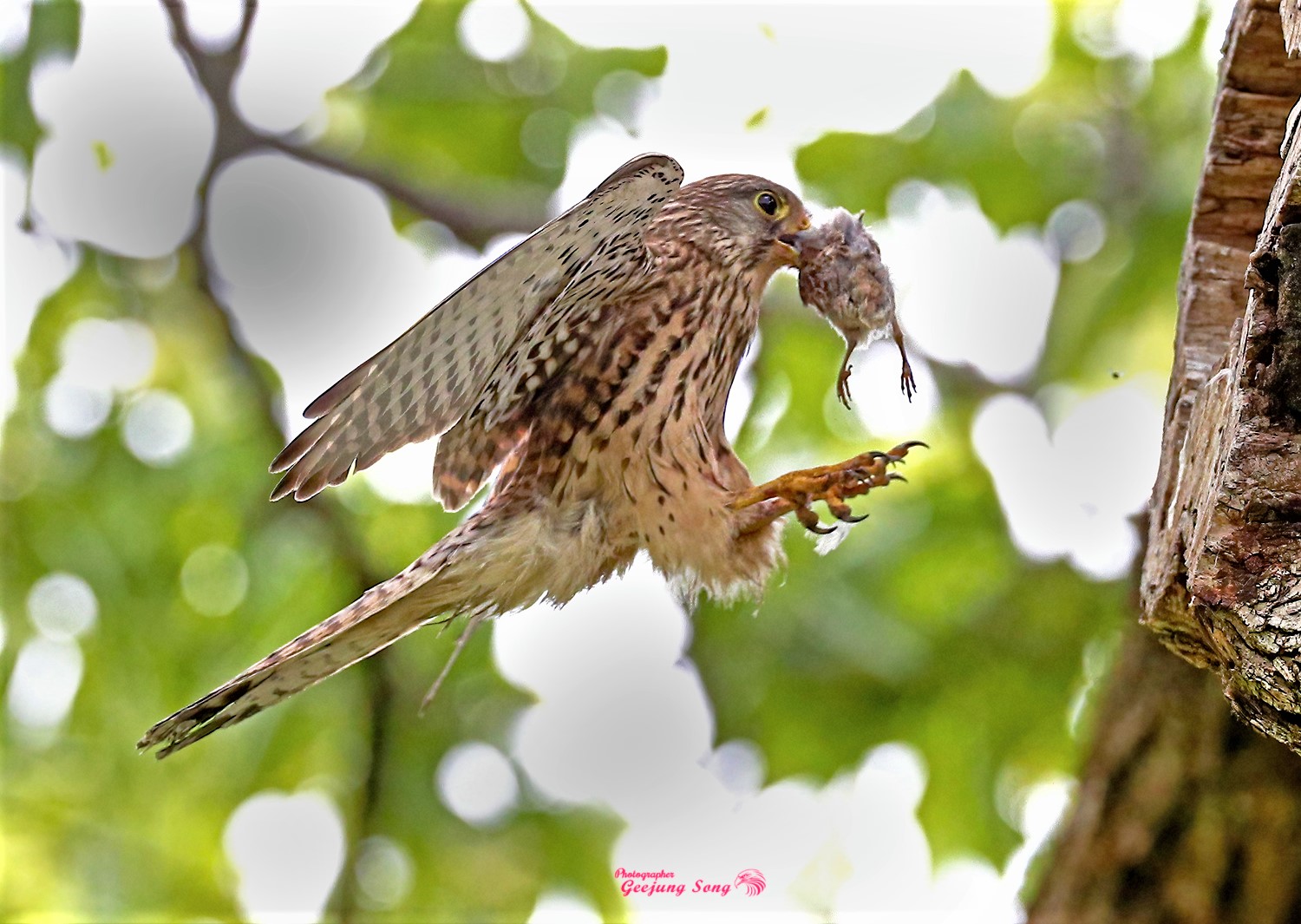 사진은 13일 경남 창원시에서 온 송기정 작가가 본사에 기념으로 제공한 황조롱이가 개구리를 잡아 둥지에 있는 새끼들에 전해주는 순간. 그리고 밑 사진은 새 다른 먹이를 잡아와 새끼들에 전해주고 있는 모습.