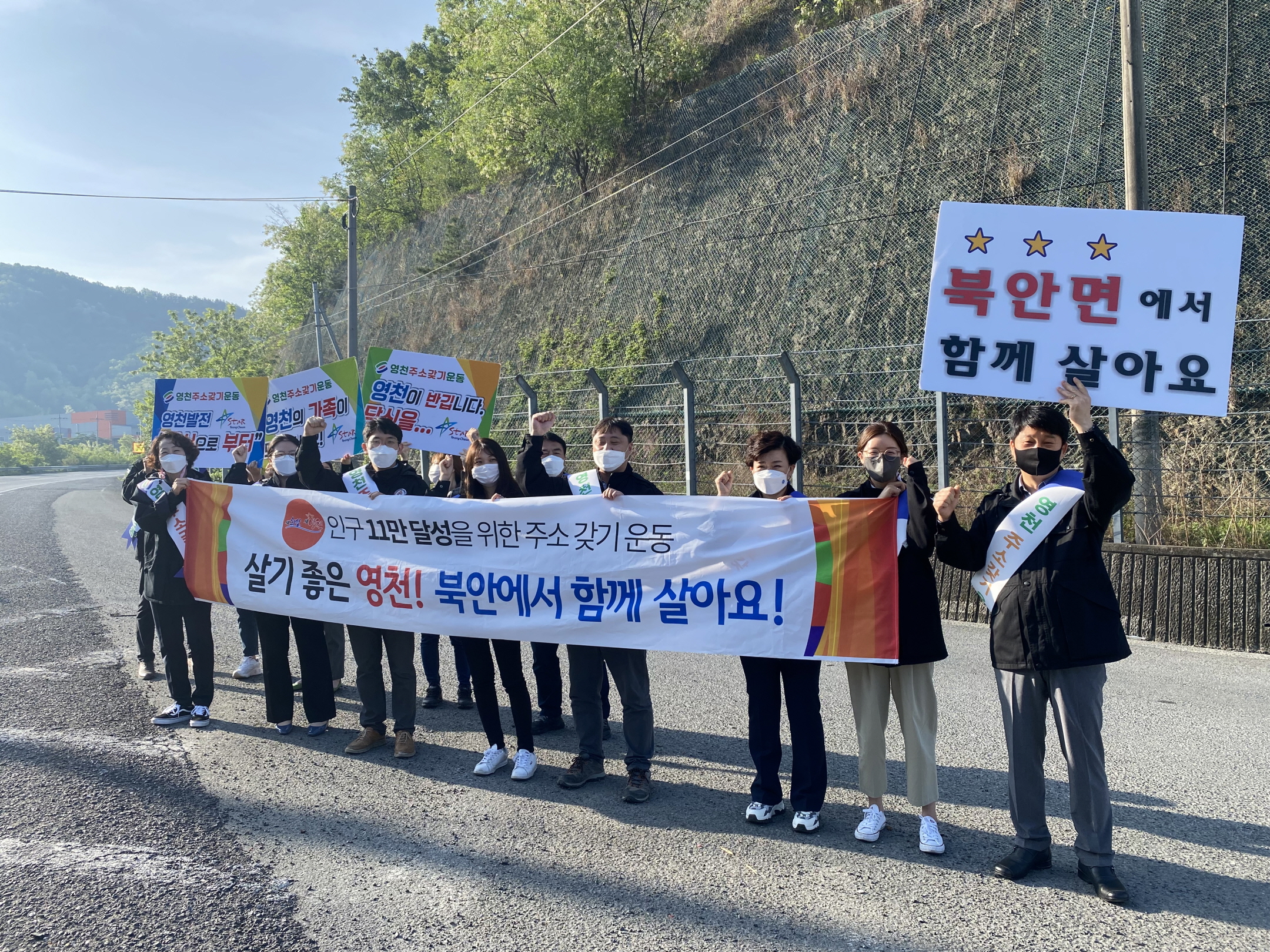 북안면(면장 윤동훈)은 5월 13일 11만 영천인구 달성을 위해 타 시·군·구 지역 주민들의 출근 차량 통행이 잦은 푸른언덕 휴게소에서 직원 20여 명이 ‘북안에서 함께 살아요’ 인구 늘리기 캠페인을 실시했다.