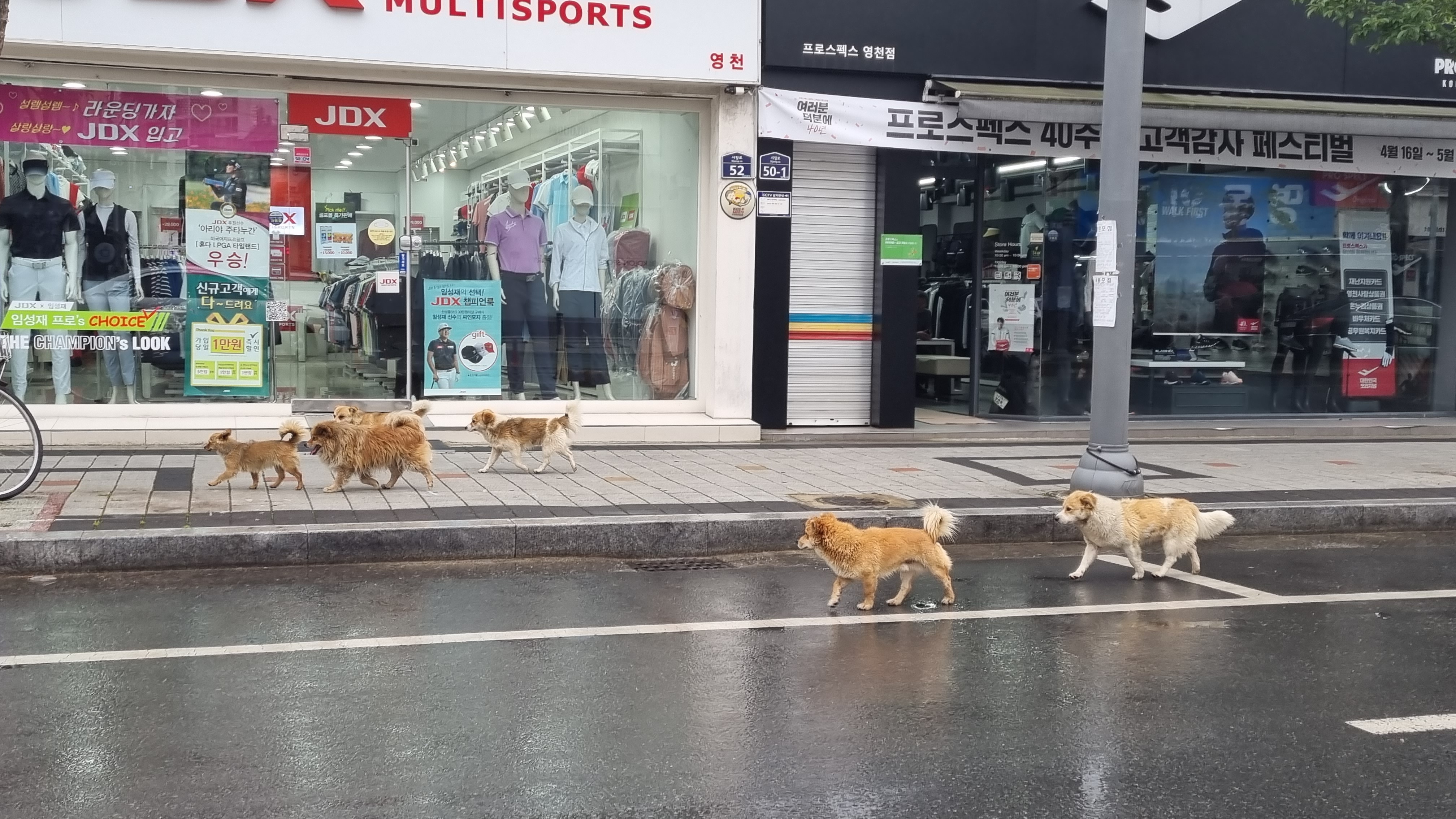 25일 오전 10시경 도심 한복판인 완산동 영천농협과 대구은행 사이 인도와 도로복판에 개떼 7마리가 출현해 인근 상인들이 놀라기도.