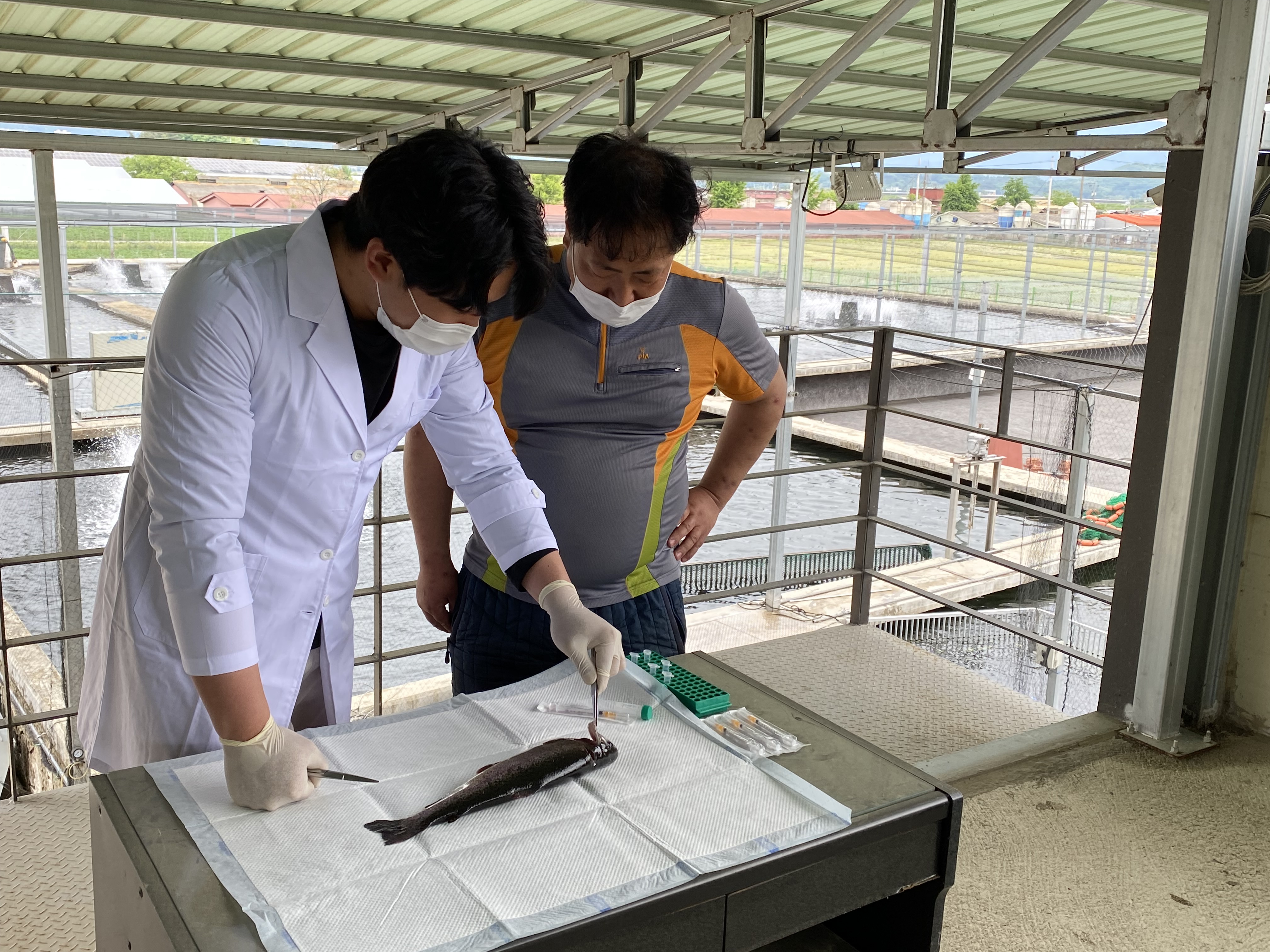 2021년 경상북도 어업기술센터 수산물안전팀 연구사 3인과 위촉된 4인의 공수산질병관리사는 5월까지 누적 300건 이상 질병모니터링을 실시하였다. 5월 질병모니터링 중 기생충성 질병 3건, 세균성 질병 4건을 진단 후 적절한 약제처방으로 조기에 치료할 수 있었다.