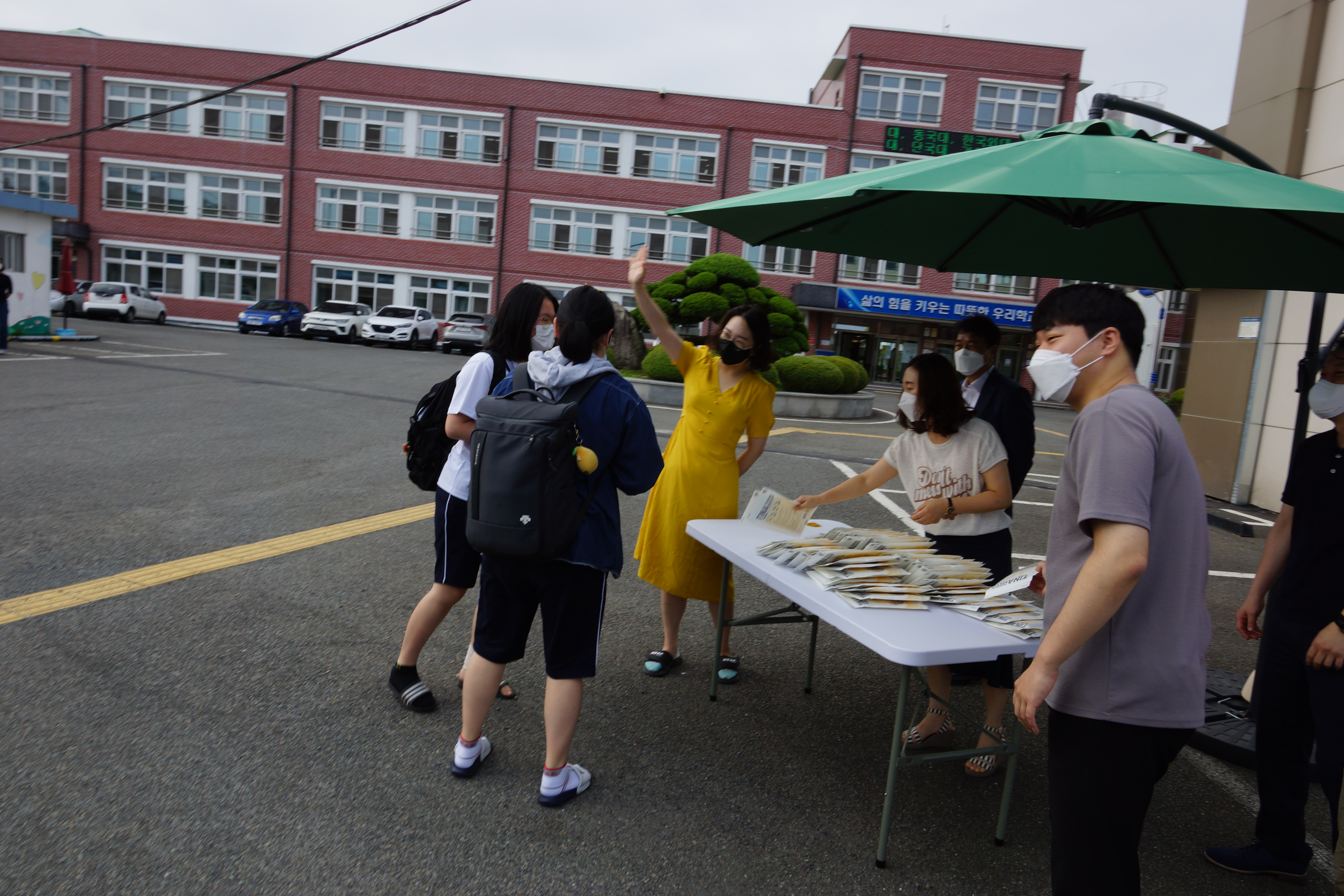 전교생이 모두 등교하는 날 담임선생님들께서 등교하는 학생들에게 ‘억수로 반갑데이’하며 뜨거운 격려와 위로의 말을 전하였고 예쁜 마스크를 나누어 주는 따뜻한 행사가 진행되었다.