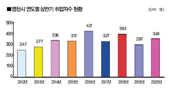 이는 2021년 상반기 구직에 성공한 취업인원이 409명으로 2020년 상반기 취업자 수 349명 대비 17.1%(58명) 증가한 셈이다. 코로나19 사태에도 불구하고 영천시 취업자 수가 전년 동기대비 증가한 것으로 조사돼 연간목표를 초과달성했다. 최근 10년 동안 상반기 실적을 보면 400명 이상 취업자 수를 기록한 사례는 두 차례에 불과했다.