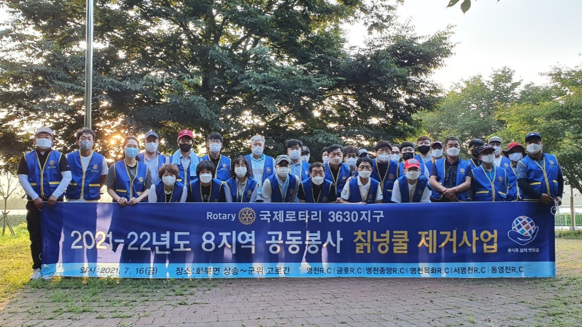 이번 공동봉사에는 화북 상송~군위고로간 도로변에 잣나무 칡넝쿨을 제거했다. 영천지역 로타리클럽은 매년 이곳에서 공동봉사를 펼쳐 오고 있다.