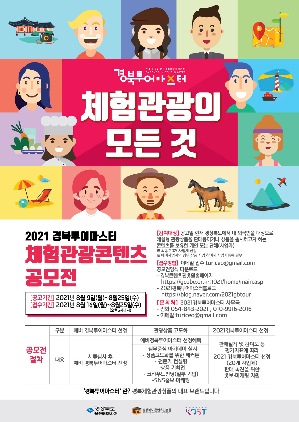 경상북도(도지사 이철우)는 경상북도콘텐츠진흥원(원장 이종수)과 함께 16일부터 25일까지‘2021 경북투어마스터(체험관광콘텐츠)공모전을 개최한다.