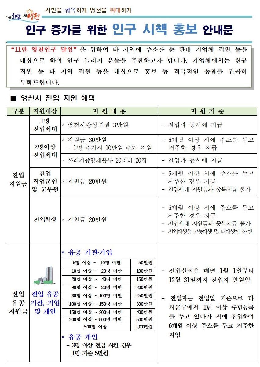 함께하는 ‘인구 늘리기 운동’을 위한 기업체 협조 요청- 서한문 및 홍보 안내문 발송-