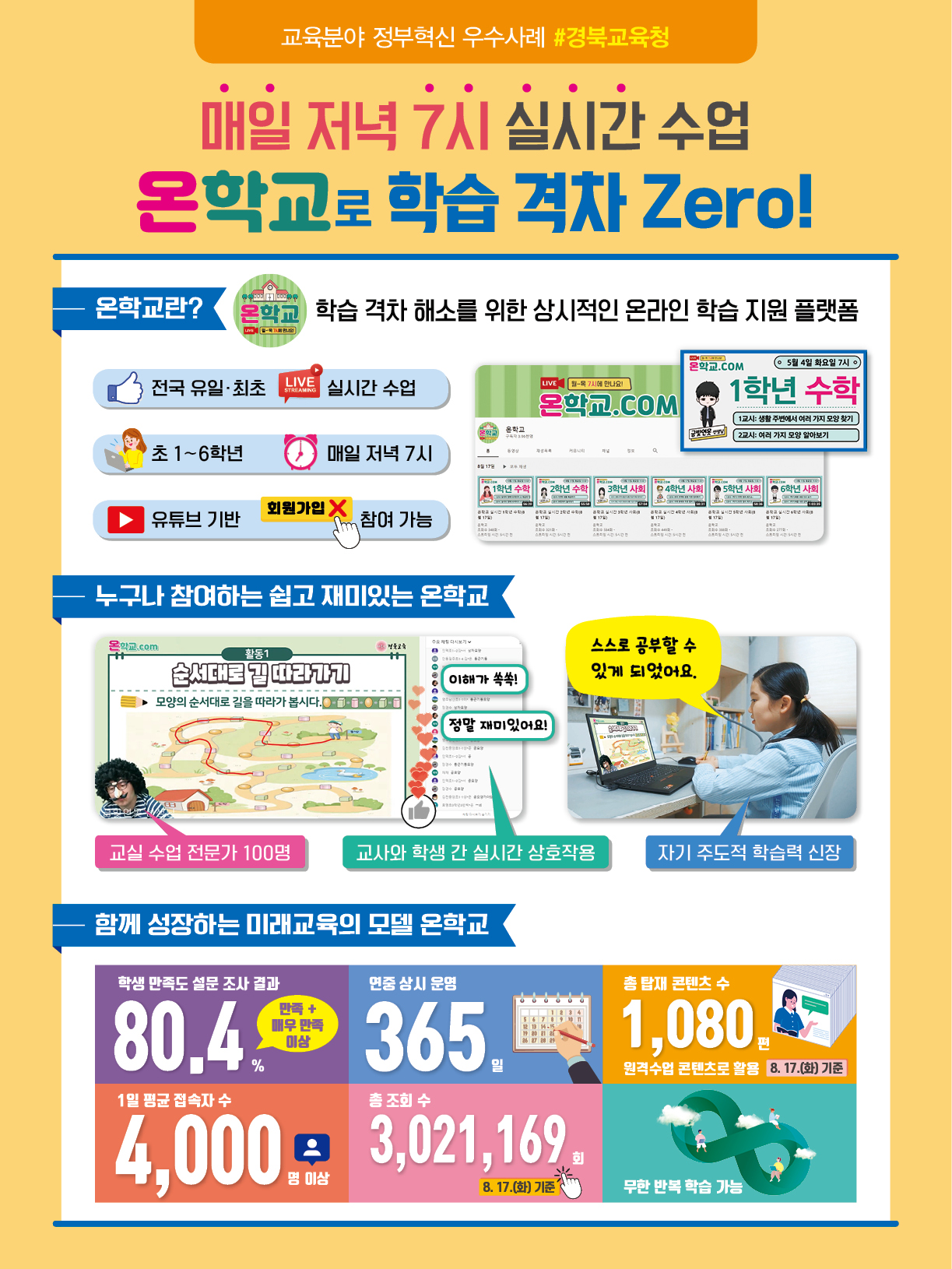 경북교육청(교육감 임종식)은 교육부 주관 교육분야 정부혁신 우수사례 경진대회에서 ‘매일 저녁 실시간 수업 「온학교」로 학습 격차 Zero’정책이 우수사례로 선정됐다고 23일 밝혔다.