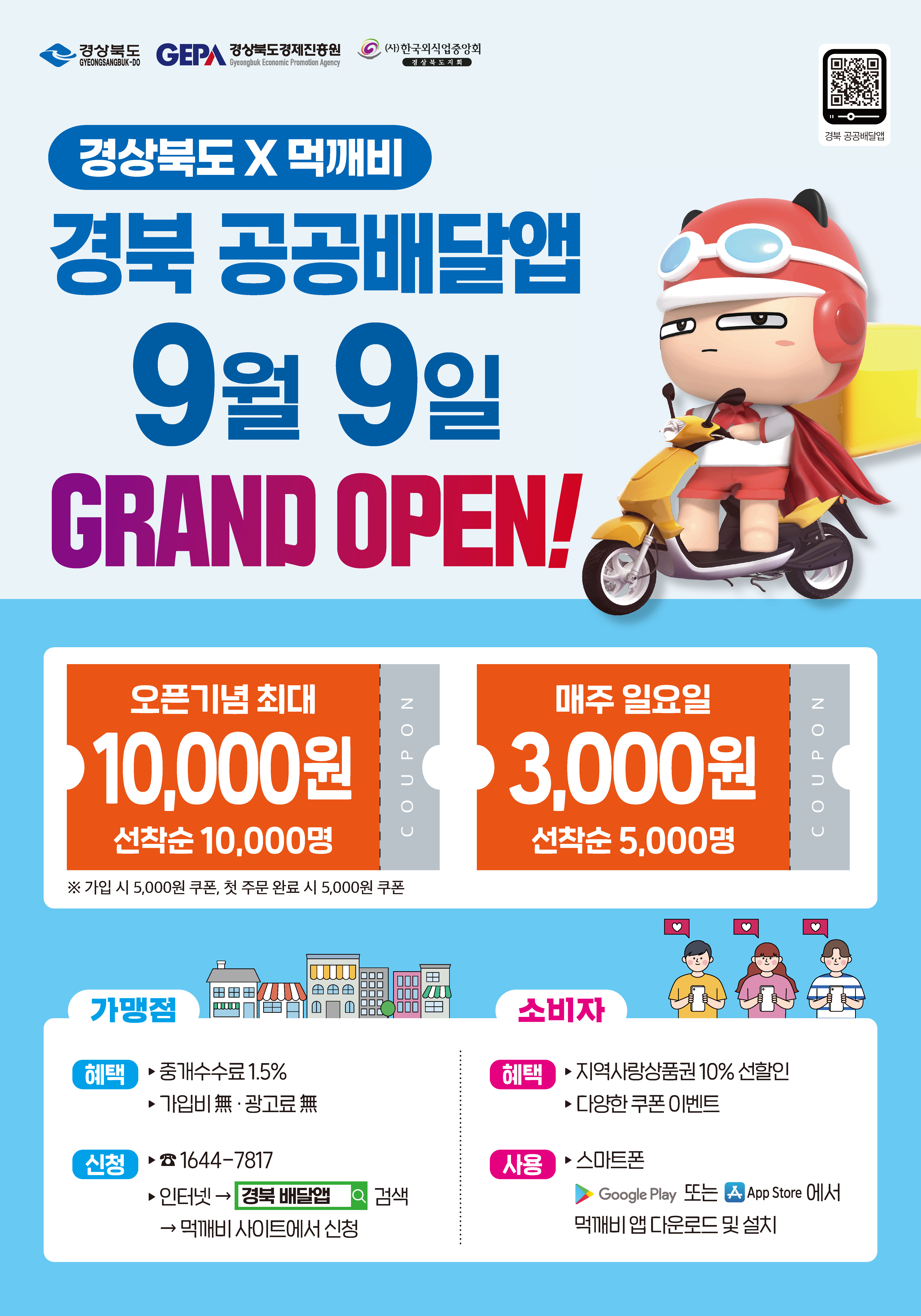 경북 공공배달앱, 9월 9일 정식 오픈 - 11개 시군 동시 오픈, 최대 1만원 할인 쿠폰 혜택 -- 국민지원금 사용 가능, 4번 주문하면 1만원 환급 외식 소비쿠폰 지급