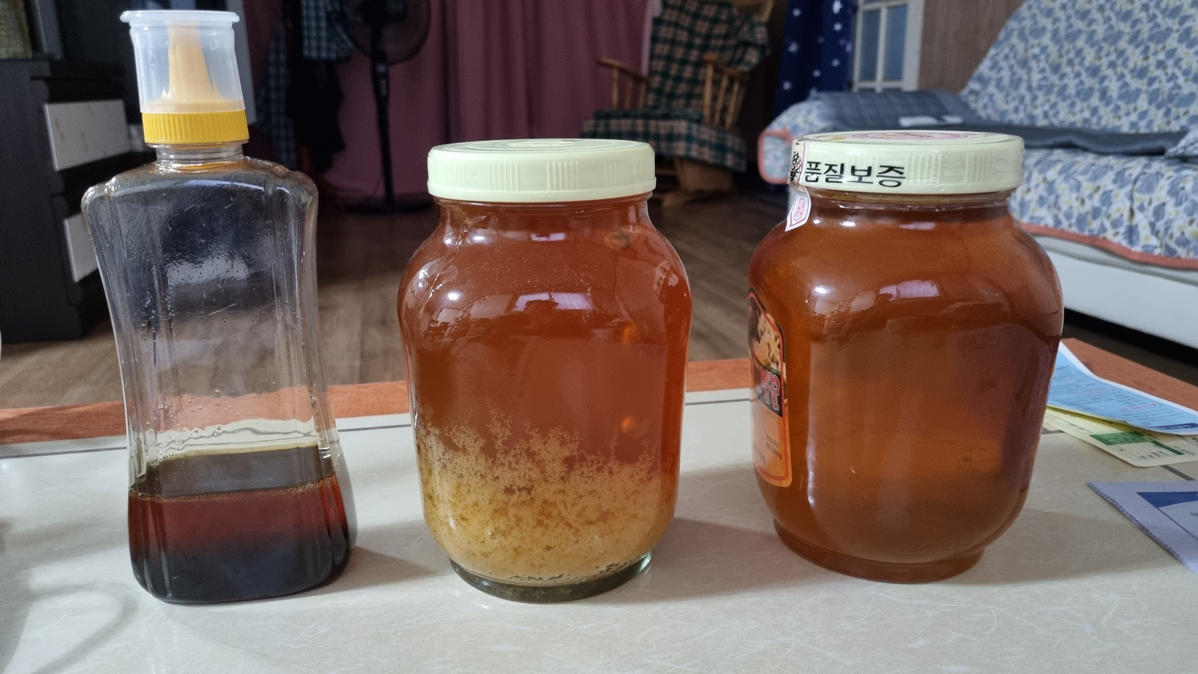 영양소가 떨어지는 꿀은 병을 보면 쉽게 알 수 있다. 장시간 보관한 병을 보면 자연산은 그래도 이지만 인공적인 것은 병 밑 부분이 허옇게 가라앉은 것이 보인다. 확연히 구분 할 수 있다. 이래서 꿀은 양심을 사고 파는 것이라고 한다.