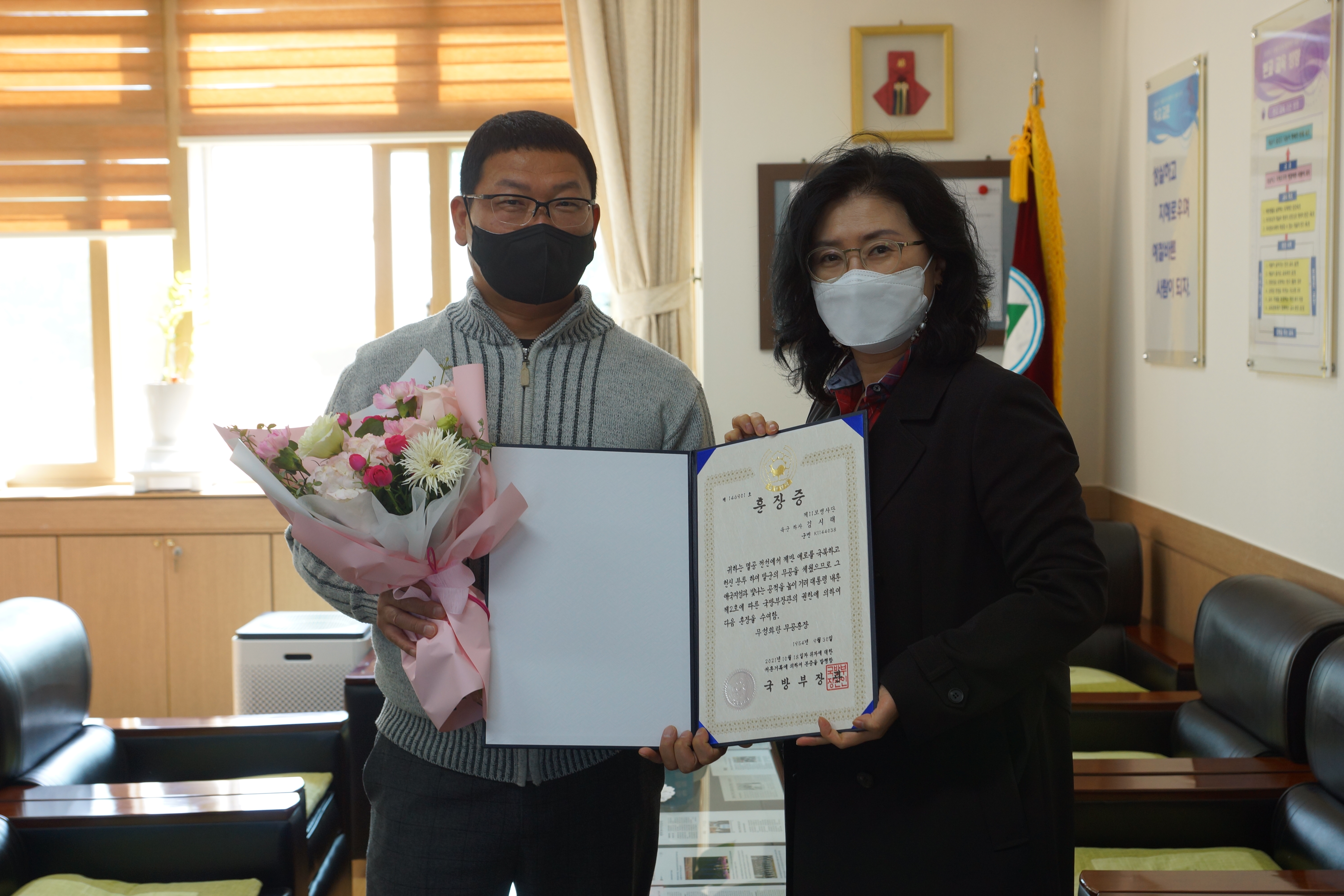 이날 영천여자고등학교는 국방부장관을 대신해 6·25전쟁에 참전해 무공을 세우신 김 하사의 손자 김재춘 씨(영천여고 시설관리 주무관)에게 무성화랑 무공훈장 및 훈장증을 전수했으며 그는 육군 제11보병사단 소속으로 참전해 혁혁한 공을 세웠다.