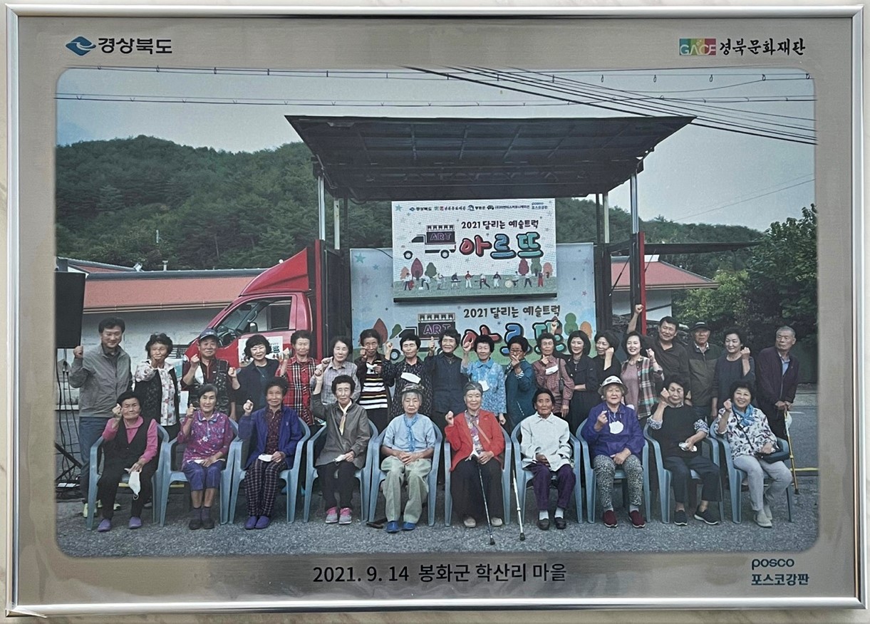 경상북도와 경북문화재단, 포스코강판은 29일 오후 봉화 춘양면 학산리 마을에서 ‘2021 달리는 예술트럭 아르뜨(ART) 1회차 행사 기념 포스아트(PosART) 전달식’을 가졌다고 밝혔다.