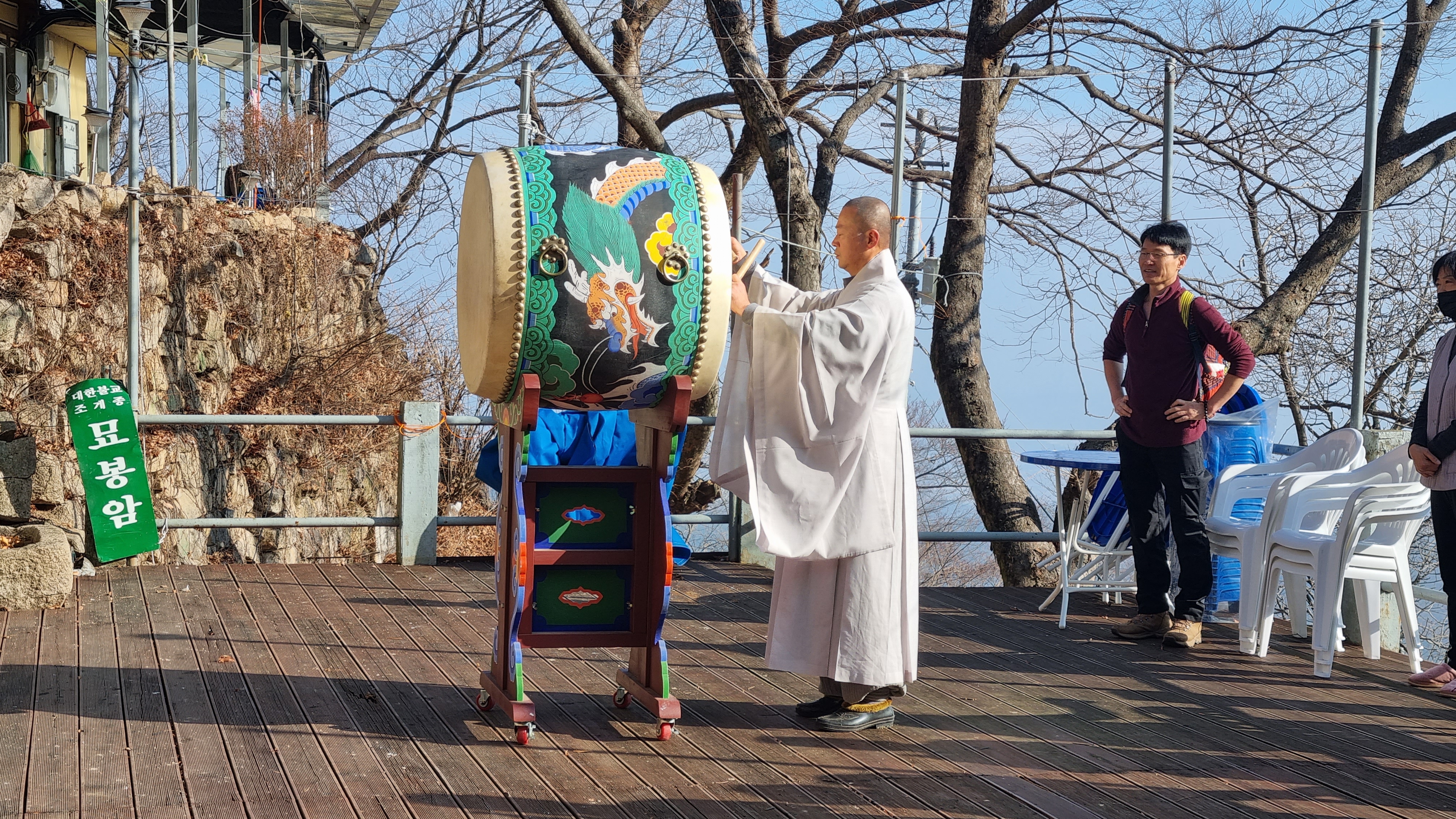 은해사 사찰중에 하나인 묘봉암에서 법고 의식을 행하는 모습이 카메라에 담겼다.