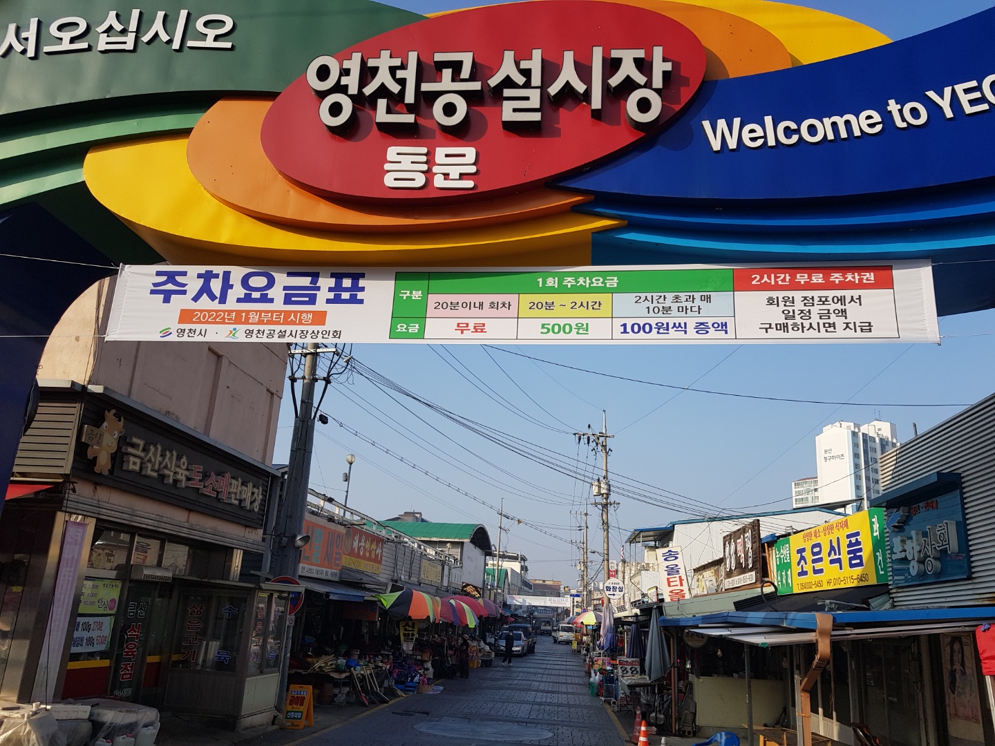 영천공설시장 주차요금이 조정된다. 종전 1시간 이내 500원 하던 주차요금을 20분에서 2시간내 500원으로 하는 주차요금 조정안을 홍보하고 있다. 20분 이내는 무료다.
