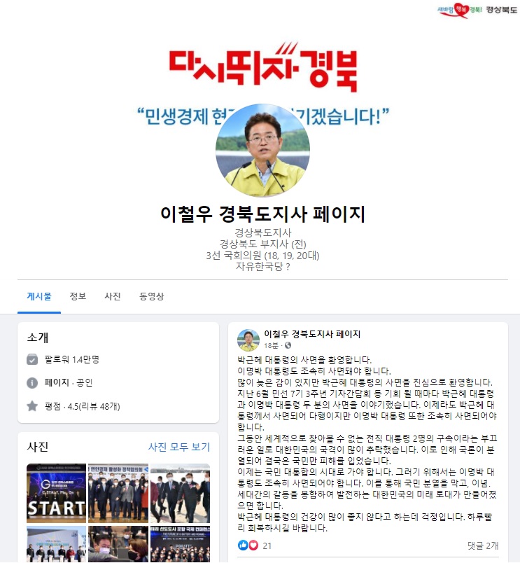 이날 이철우 경북도지사는 페이스북을 통해 박근혜 대통령 특별사면복권에 대해 입장을 밝혔다.