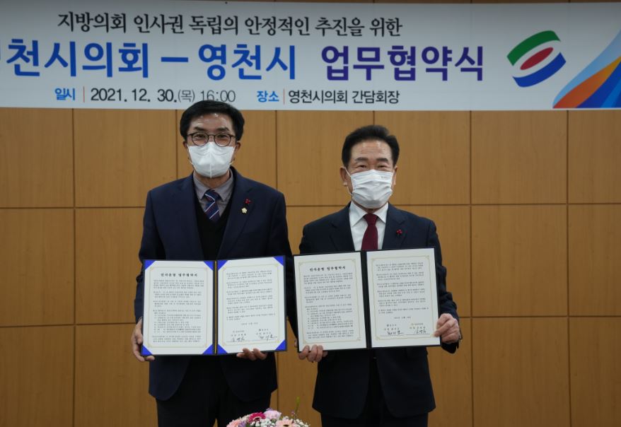영천시의회(의장 조영제)는 지난 12월 30일 영천시의회 간담회장에서 영천시의회·영천시 인사운영 협약식을 가지고 의회 인사권 독립 조기정착을 위한 협력을 다짐했다.