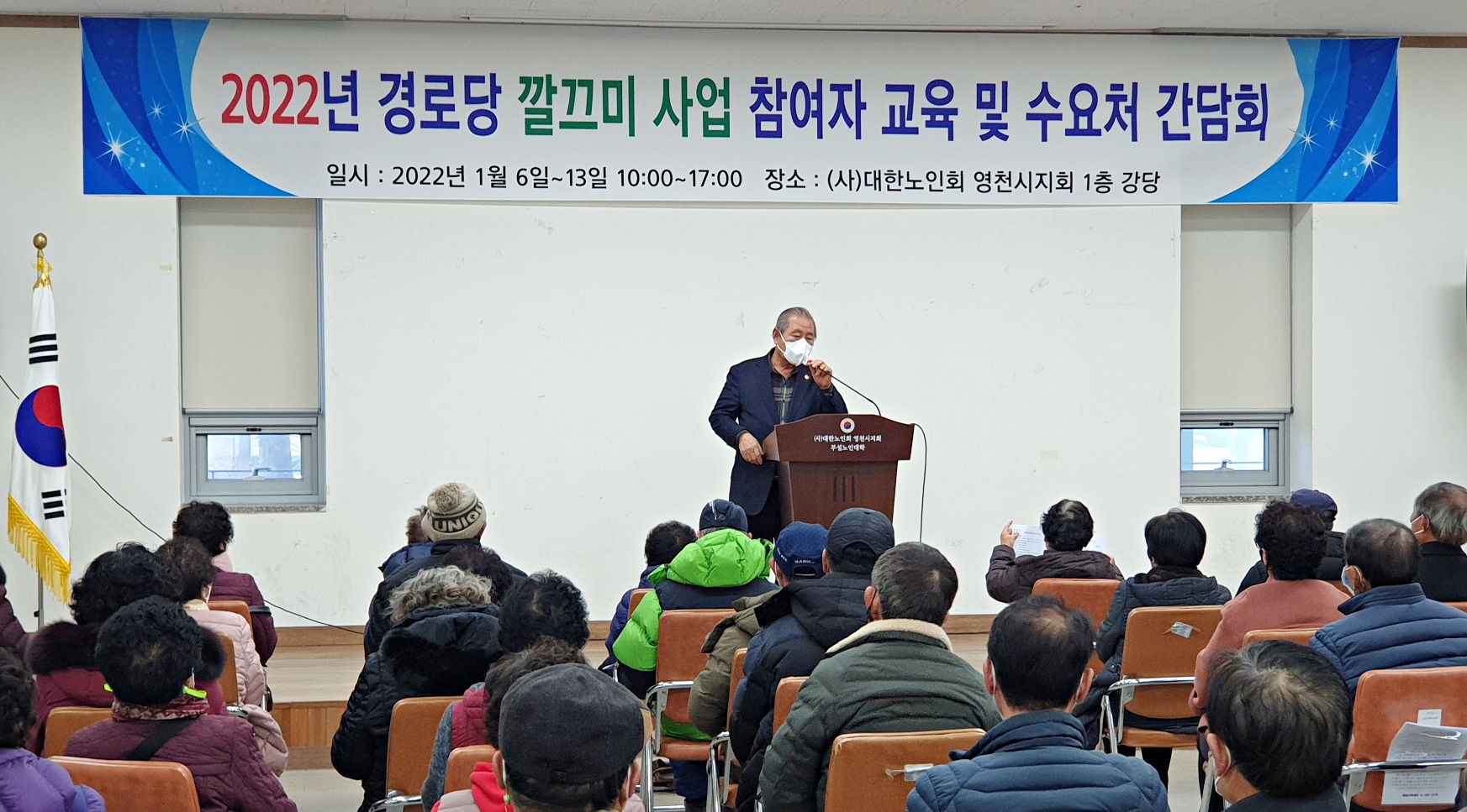 대한노인회 영천시지회(지회장 성낙균)는 2022년 영천시 노인 일자리 경로당 깔끄미 사업 추진을 위한 참여자 교육을 1월 6일부터 13일까지 영천시종합복지센터에서 실시한다.