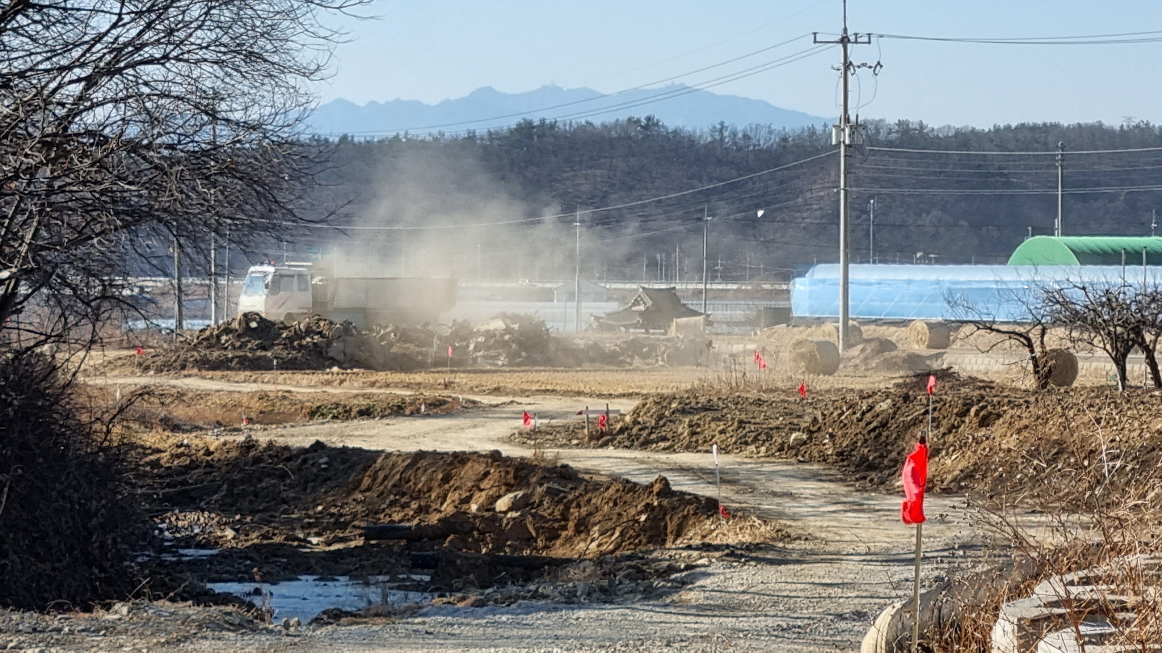 11일 오후 고경면 창상리 한 공사현장에 대형트럭들이 흙을 실어 나르면서 농로를 드나들고 있었는데, 트럭마다 비산먼지가 심하게 발생, 일대를 뒤덮으며 휘날리고 있었다.