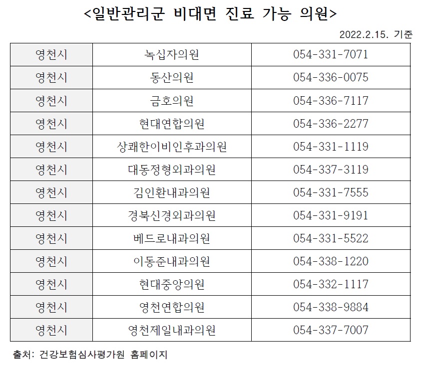 현재 영천시 내 일반관리군 대상자가 비대면 진료를 받을 수 있는 기관은 13개소이며 건강보험심사평가원(www.hira.or.kr)과 영천시청 및 보건소 홈페이지를 통해 가능 의료기관을 확인할 수 있다.