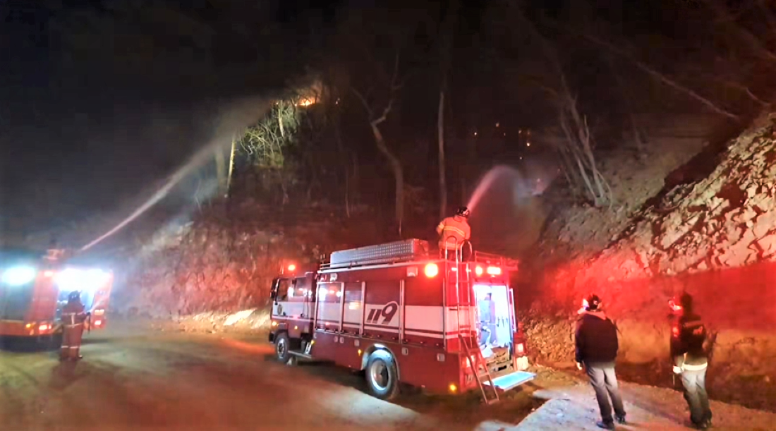 밤새 울진 응봉산 정상에서 시작된 산불이 금강송 군락지 인접까지 남하해 임도 25m 지점까지 다가오는 급박한 상황이었다.