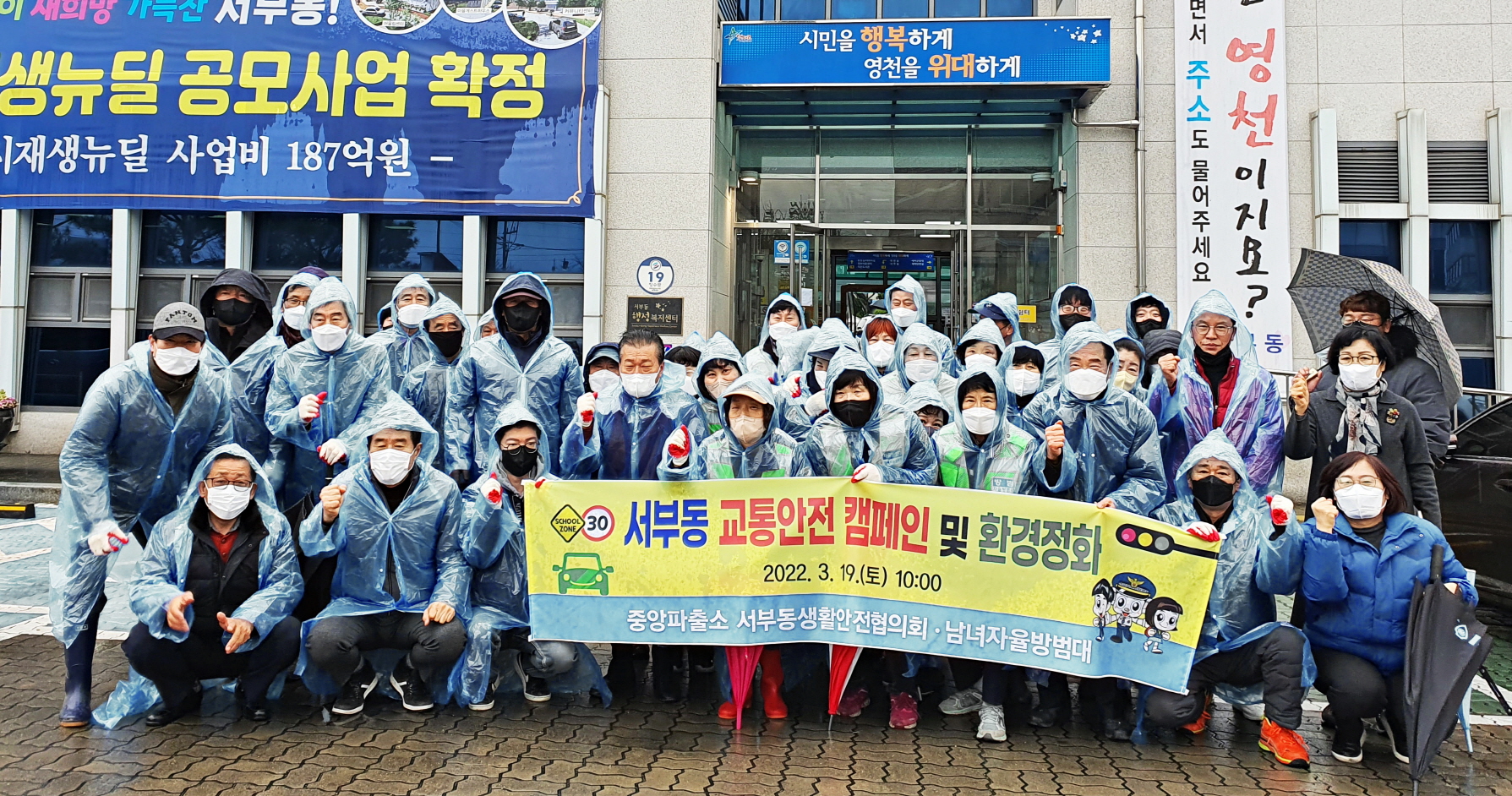 서부동생활안전협의회(회장 김동식), 서부동자율방범대(대장 양현철), 서부동부녀자율방범대(대장 박영옥) 등 회원 50여 명은 3월 19일 교통안전 캠페인 및 환경정화 활동을 펼쳤다. 우천에도 불구하고 회원들은 안전한 서부동 만들기를 위한 교통안전 캠페인에 이어 고향의 강 일원에 환경정화 활동을 함께 실시했다.