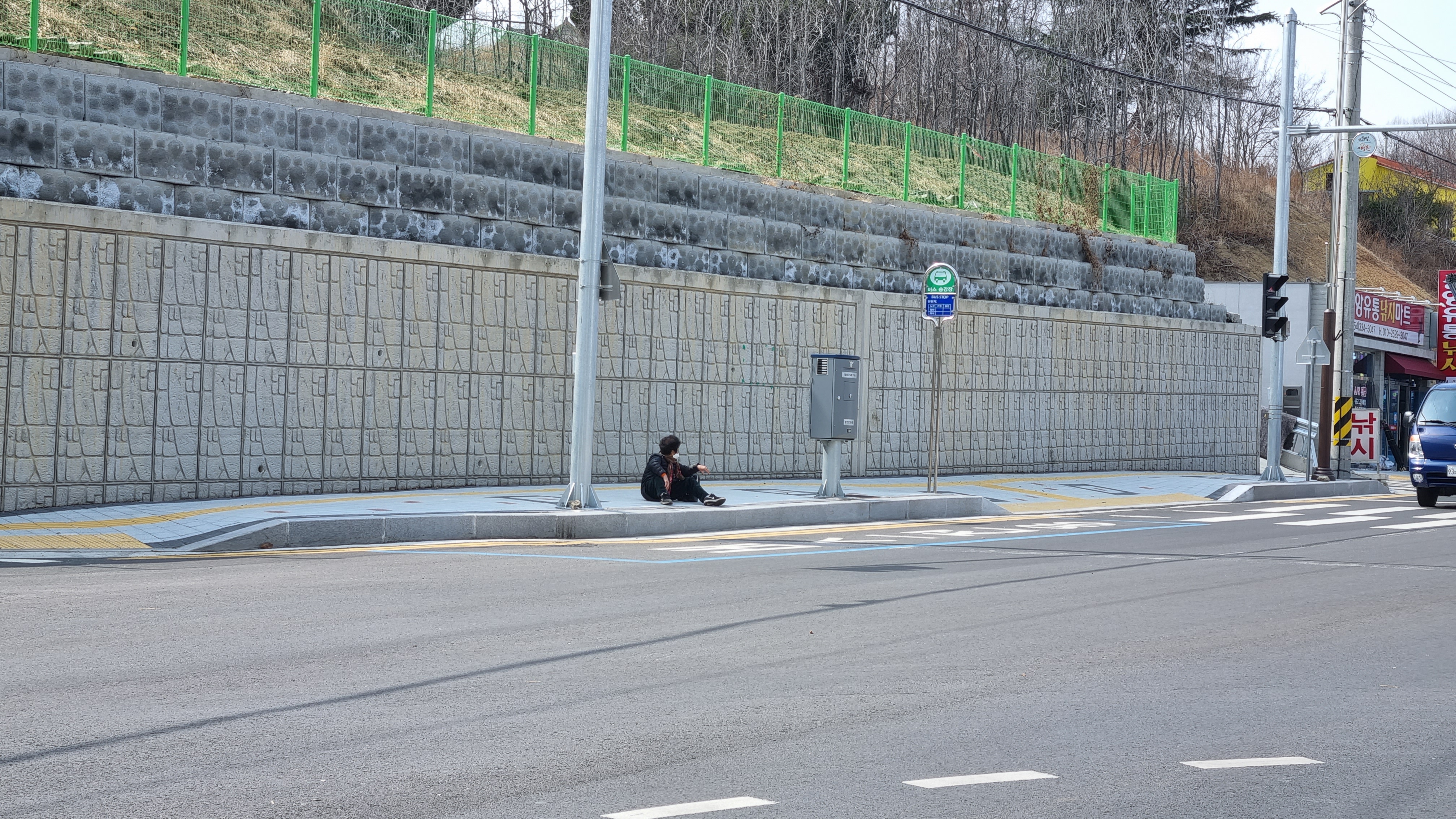 새롭게 도로확장한 중앙동 문내주공아파트 앞 인도에 한 할머니가 등에 멘 가방을 옆에 두고 바닥에 앉아 쉬고 있는 모습이 카메라에 들어왔다. 이처럼 넓은 인도에도 영동교에 설치한 쉬는 의자가 필요한 듯 해 보였다. 할머니는 잠깐 쉬고 다시 일어나 가는 길을 걸어갔다.