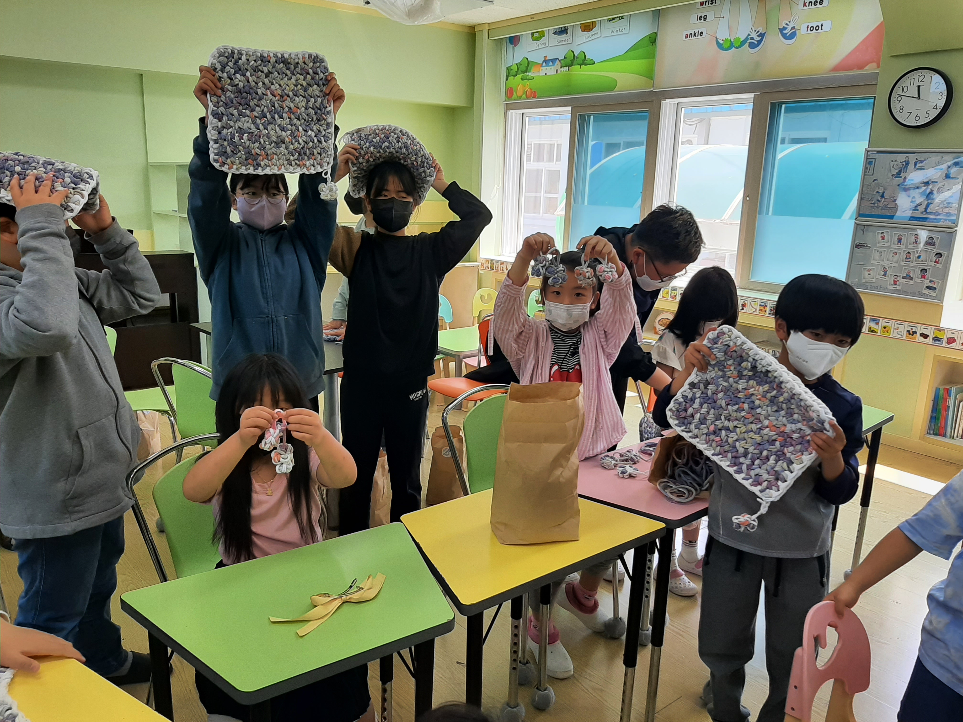 오전에는 양말이 완성되고 잘라내어 버려지는 양말목을 활용하여 공예에 접목하는 양말 목공예를 실시하였다. 깨끗하게 손질하고 세척된 양말목을 공예 재료로 활용하여 손가락으로 뜨는 핑거니팅 방식으로 자신이 원하는 물품을 제작하였다.