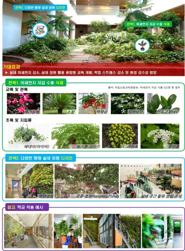 생활밀착형 정원 조성사업은 먼저, 공공시설 내 실내 유기화합물 농도저감 및 공기 질 개선을 위해 병원·도서관·기차역·공항, 대학교 등을 대상으로 하는 실내정원 조성사업이 있다.