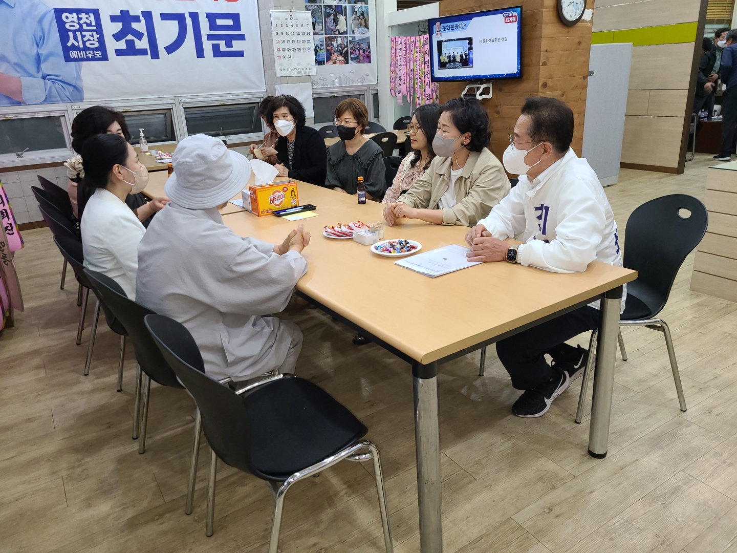 영천시어린이집연합회 회원들이 5월 11일 최기문 후보를 응원하기 위해 선거사무소를 방문하고 최기문 후보와 담소를 나누며 즉석 간담회를 가졌다.